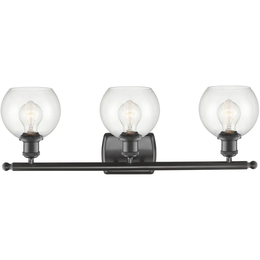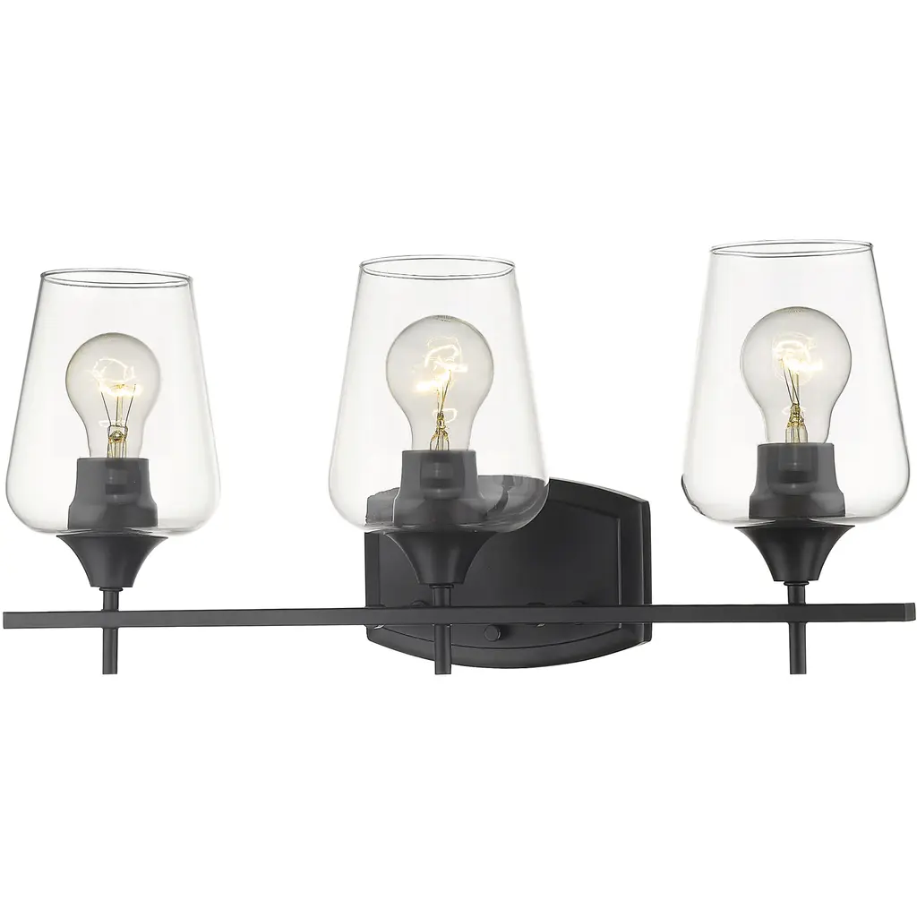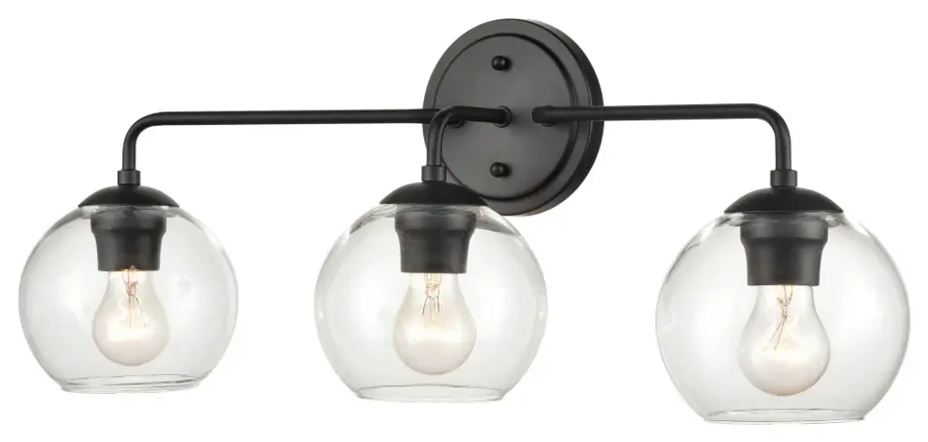 Spatial showcases a modern form that complements Urban Industrial and Bohemian styles. Overscaled geometric frames feature designs inspired by metal trusses and the art of engineering. A Matte Black finish is highlighted by clear globe shades or open candles. Chandelier and pendant options are ideal for foyers and entryways, while vanity fixtures complement modern spa-like bath suites. Uses (3) 60-watt candelabra bulbs (not included). UL Certified: NoETL Certified: Yes