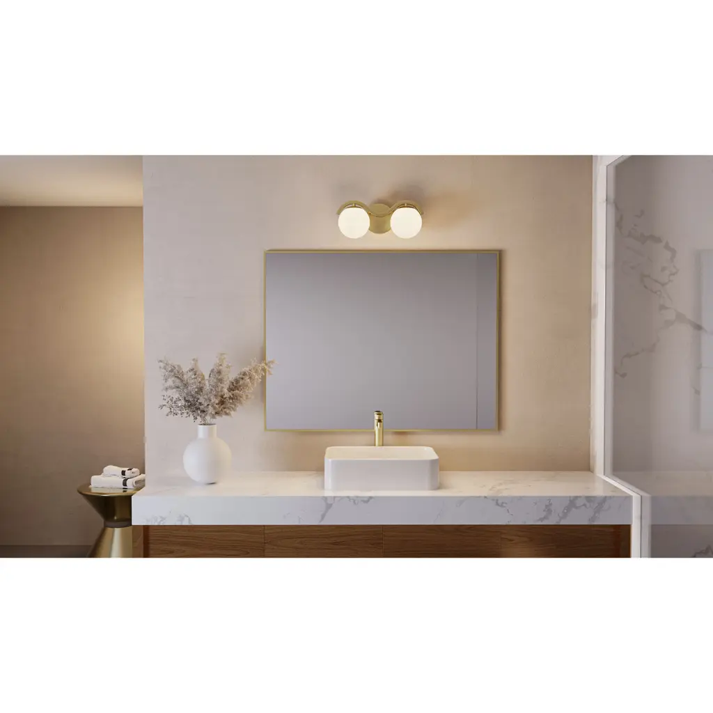 True to its name, the Spherical vanity light embodies modern art with its graceful curved lines and distinctive glass orbs. Finished in lustrous aged brass, this sculptural fixture features striking white cloud glass spheres that make a bold style statement. Available in multiple size options, the Spherical bath light offers flexibility to suit any bathroom space. Hang Spherical over any bathroom vanity to achieve instant, eye-catching illumination.