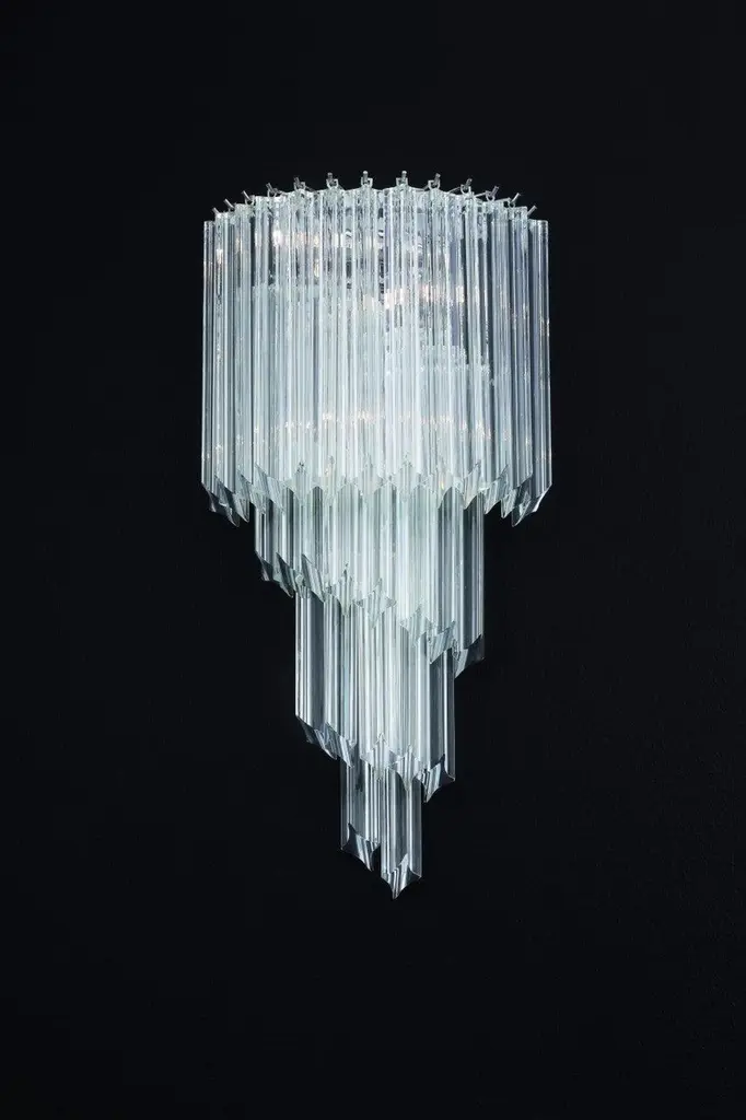 Italian wall light with clear Murano glasses handcut into four points using Quadriedri technique, mounted on chrome finish frame / Designed by Fabio Bergomi / Made in Italy3 lights / E12 or E14 type / max 40W each Measures: Height 23.5 inches / diameter 12 inchesOrder only / This item ships from ItalyPlease inquire for custom options / pricing / current lead times Order Reference: FABIOLTD W216