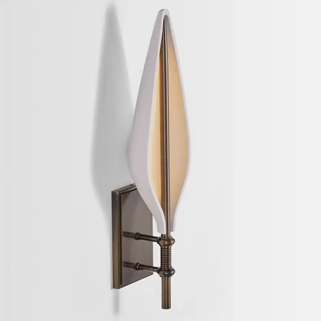 The Spire LED Wall Sconce from Boyd Lighting is an artful beauty, making a connection between a church’s epic spire and a leave’s pointy shape. The sconce surprises as it feels familiar yet sets itself apart as a functional piece of art. It reveals its transitional personality with a classically styled brass backplate. Turned brass rods move your eyes from the bottom up in one quick motion. The rod evokes the central, connecting line running across a leaf. Surrounding it, a gorgeous porcelain shade presents a delicate, pointy silhouette. LED light points at the interior of the porcelain and fills it up with a warm ambient glow.