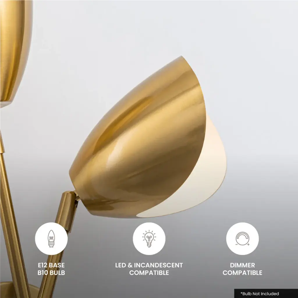 Named the Splay Collection for the adjustable arms and rotatable light heads used in each piece, the luxurious designs create a dynamic display of light, depth, and dimension. Crafted from high-quality steel finished in luxurious brushed brass, the artistic fixtures serve as both a functional light source and a piece of art to be styled in contemporary and modern decor. The Splay collection is available in a 4-light flush mount fixture, 2-light wall sconce, and a 10-light chandelier. Each fixture is compatible with both LED and incandescent bulbs, offering flexible lighting design options for any desired ambiance. For a complete guide to dimensions and sizing, review the full product information for each model and style.