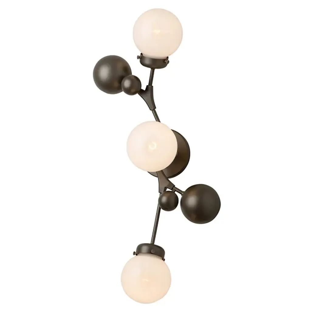 Beautiful, ornate, and a slice of nature. The Sprig Wall Sconce from Hubbardton Forge captures the free moving, dazzling, and asymmetrical essence of a plant’s sprig. Two stems that radiate up and down from the circular backplate split, giving the piece a sense of verticality. “Berries” in the form of spherical metal accents and glass shades, tie the piece together with a stylized arrangement. Incandescent bulbs and its spherical shades help create a golden ambient glow. It is a great piece illuminating entryways or framing neat mirrors.