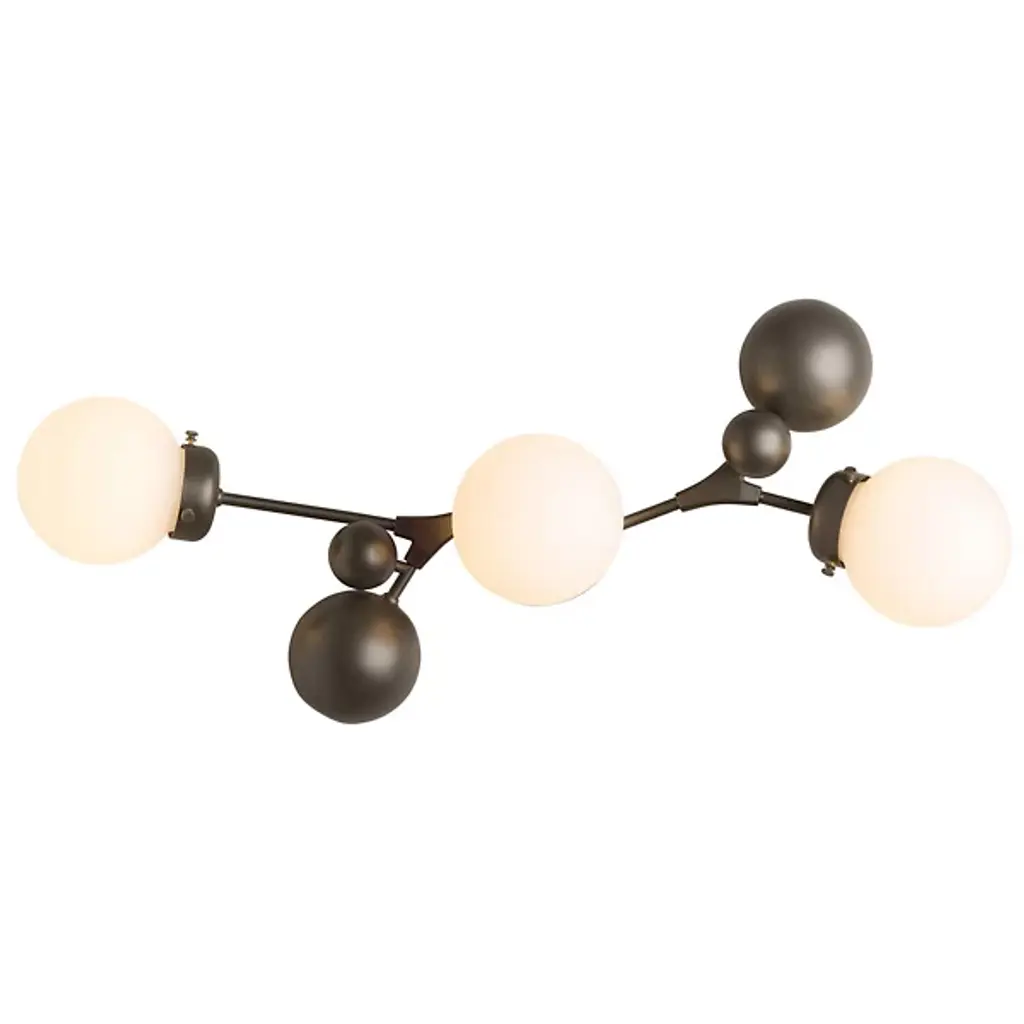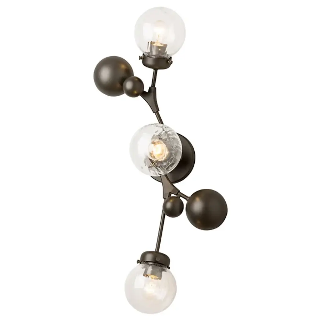 Beautiful, ornate, and a slice of nature. The Sprig Wall Sconce from Hubbardton Forge captures the free moving, dazzling, and asymmetrical essence of a plant’s sprig. Two stems that radiate up and down from the circular backplate split, giving the piece a sense of verticality. “Berries” in the form of spherical metal accents and glass shades, tie the piece together with a stylized arrangement. Incandescent bulbs and its spherical shades help create a golden ambient glow. It is a great piece illuminating entryways or framing neat mirrors.