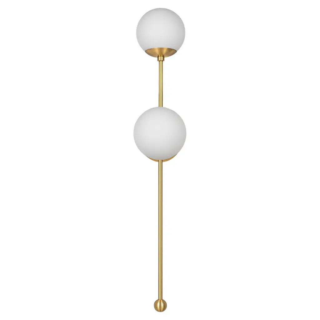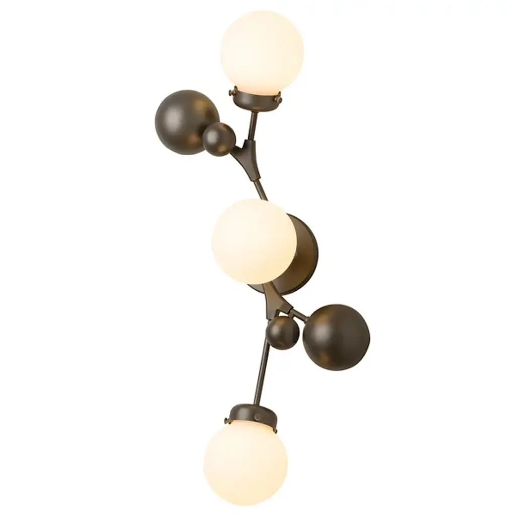Beautiful, ornate, and a slice of nature. The Sprig Wall Sconce from Hubbardton Forge captures the free moving, dazzling, and asymmetrical essence of a plant’s sprig. Two stems that radiate up and down from the circular backplate split, giving the piece a sense of verticality. “Berries” in the form of spherical metal accents and glass shades, tie the piece together with a stylized arrangement. Incandescent bulbs and its spherical shades help create a golden ambient glow. It is a great piece illuminating entryways or framing neat mirrors.