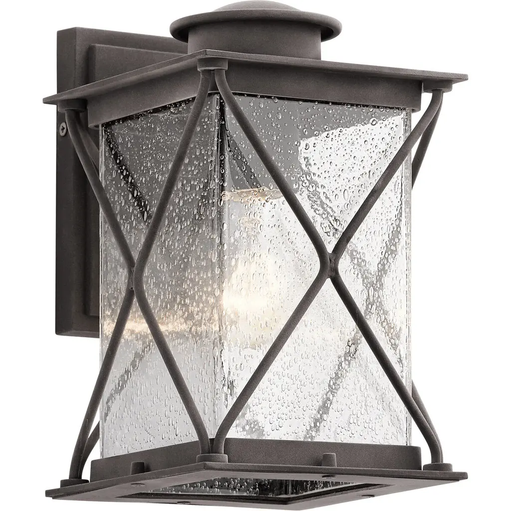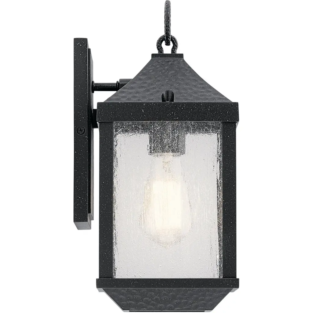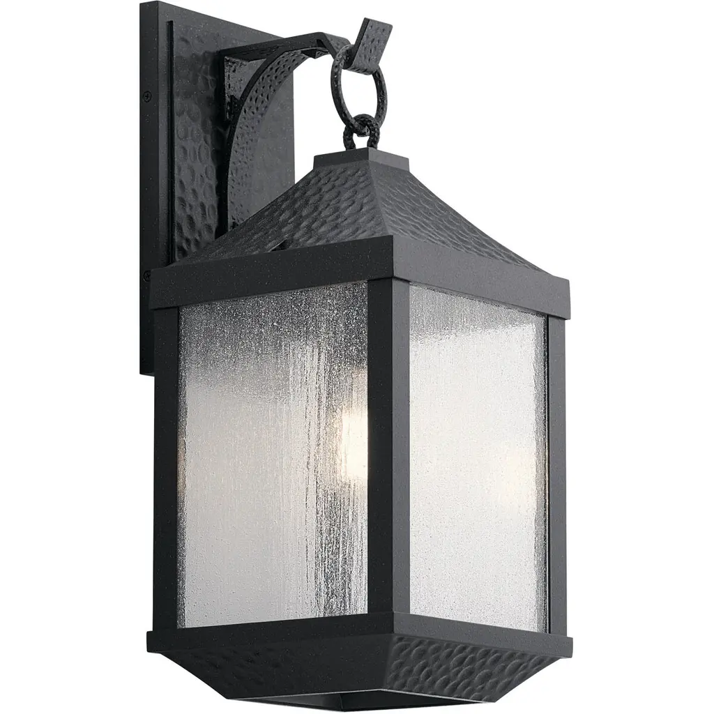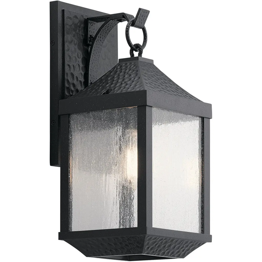 The 13.5in. 1 light outdoor wall sconce from the Springfield collection offers classic style with a weathered effect. The hammered-look metal and Distressed Black finish give each fixture texture and character, while the seeded glass softly diffuses the light.