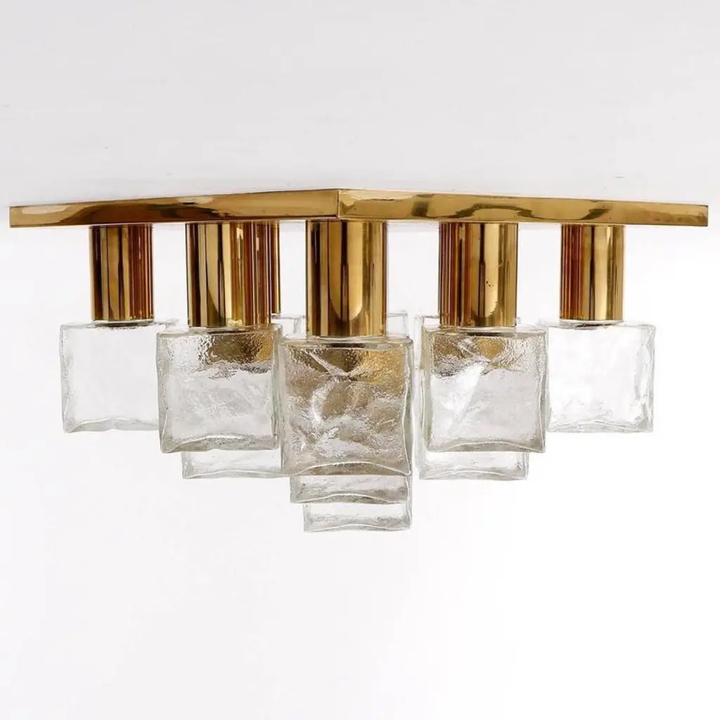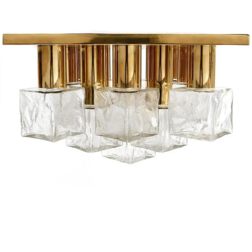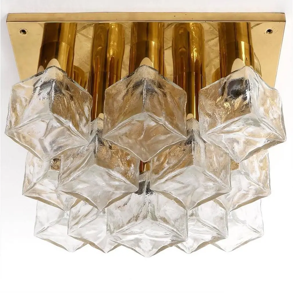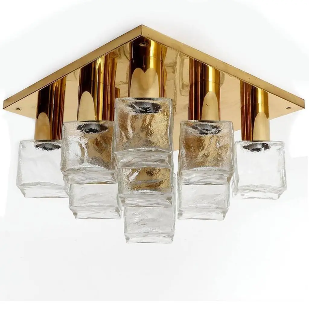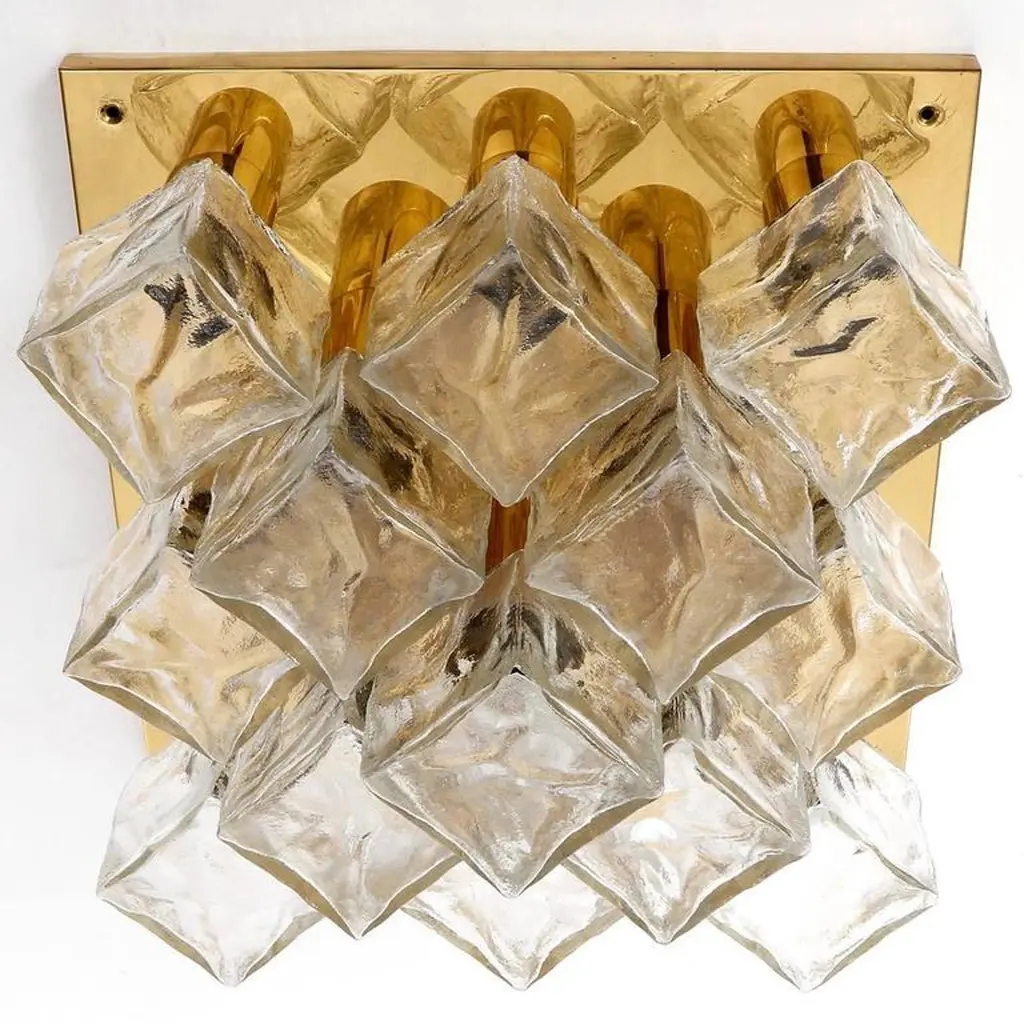 One of three fixtures model 'Cubus' (German 'Würfel') by Kalmar, Austria, manufactured in midcentury, circa 1970 (end of 1960s and beginning of 1970s).They are made of polished brass and frosted cubic glasses. There are 13 small screw base bulbs type E14 (max. 40 W per bulb) which are covered with textured ice glass cubes.It is possible to install the lamps in all countries (US, UK, Europe, Asia, Canada, ...) although it may be necessary to purchase different light bulbs suitable to local electricity. The fixtures also can be used with a dimmer.The fixtures have professionally cleaned and they are ready to use.They can be used as wall or flush mount lights.There are minor differences in the brightness or hue of the brass backplates.The price is per lamp. Currently there are three lamps available.They are sold singly, as pair or as set of three lights. Shipping cost depends on number of ordered items.Additionally there further are four matching smaller lights with five glasses available (see last Image).
