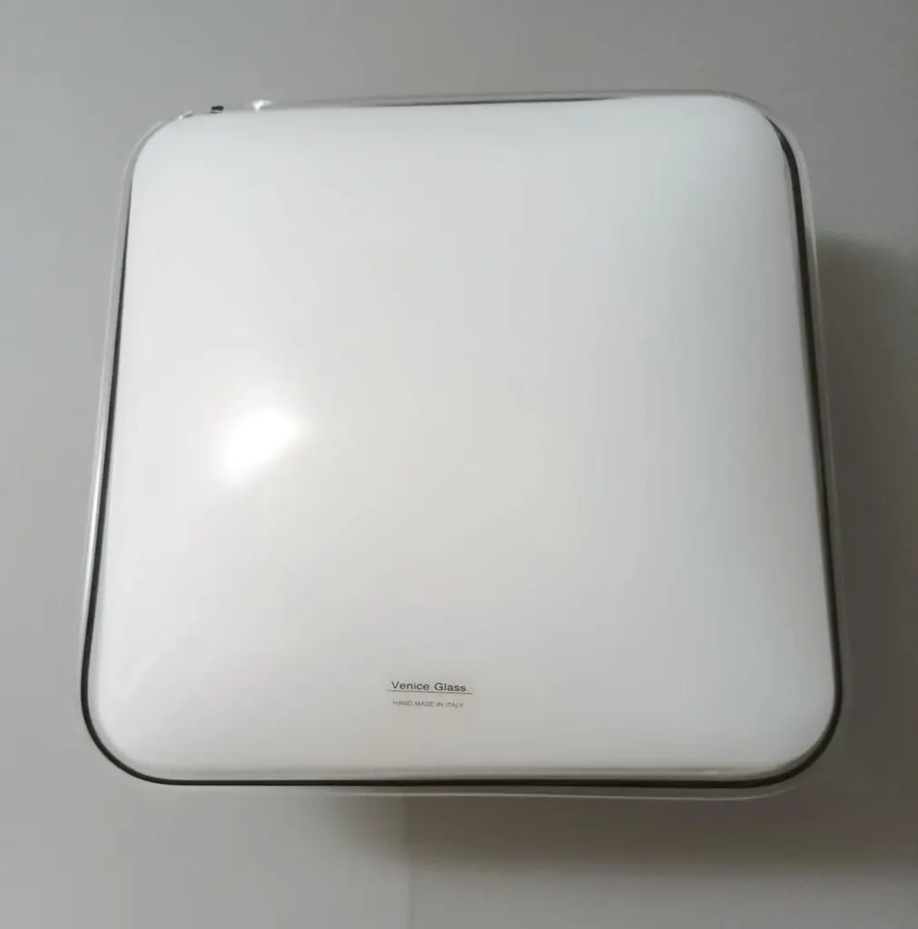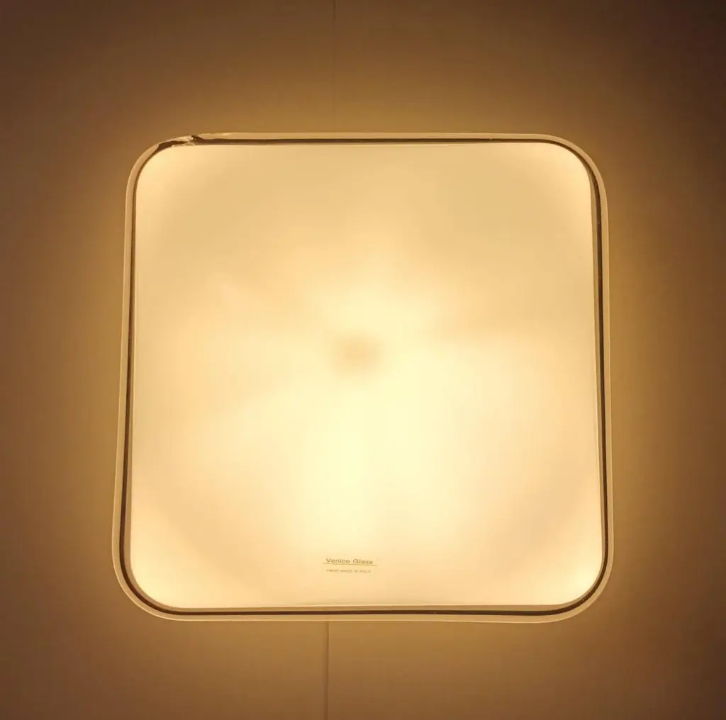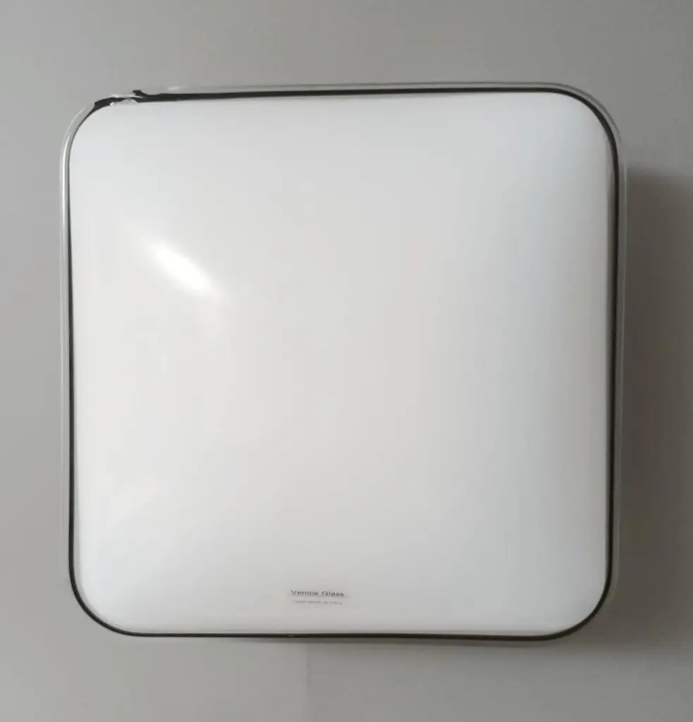 Vintage Italian flush mount or wall light with a single square milky white Murano glass shade with black border / Made in Italy in the style of Venini, circa 1960sOriginal sticker on the glassMeasures: width 10 inches, length 10 inches, height 5 inches1 light / E26 or E27 type / max 60W2 available in stock in Italy, price is for each itemOrder reference #: FABIOLTD H099