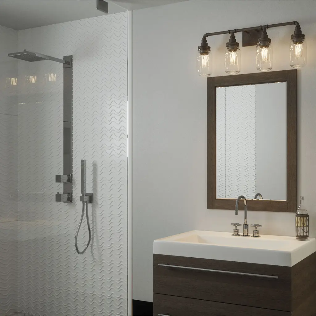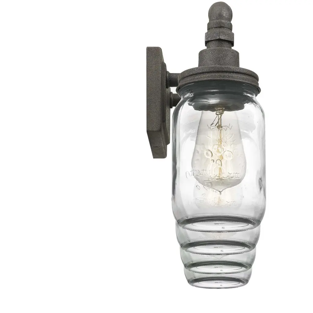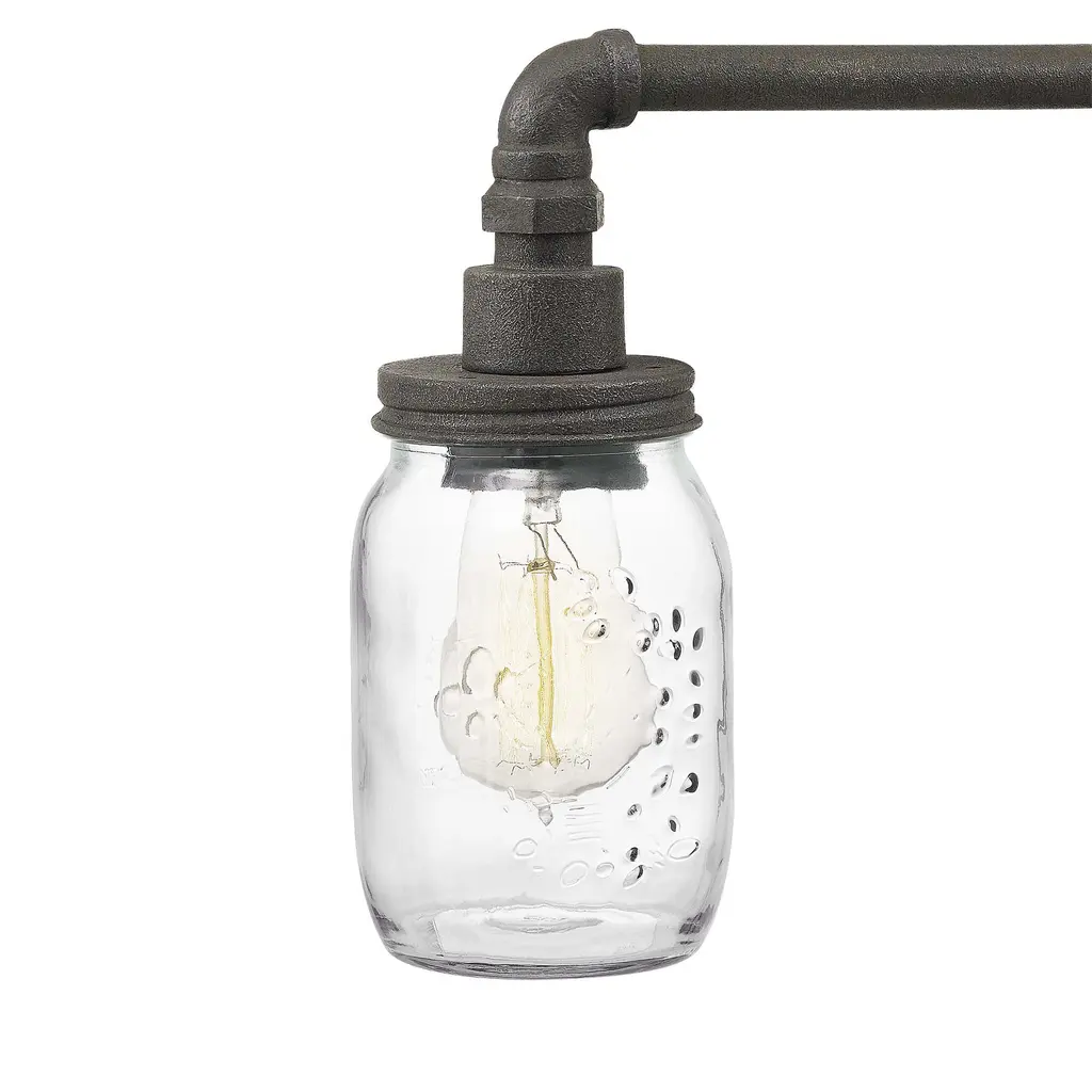 Humble, everyday elements make an innovative debut in Squire, a collection of vanity lighting embodying farmhouse aesthetic. Squires glass shades recall the shape and heft of Mason jars for a look thats equal parts upcycled and just plain charming. The arms, comprised of pipes and elbows, are coated in a rustic black finish brimming with patina.