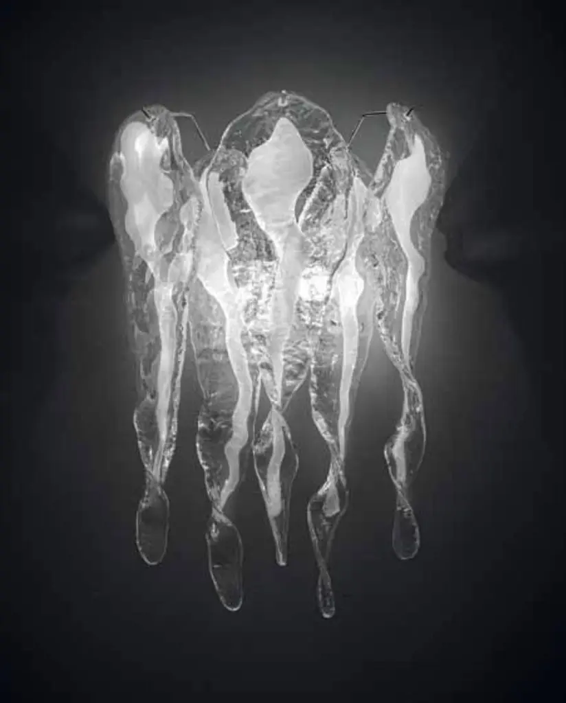 Italian wall light with milky white and clear Murano glasses hand blown to form beautiful dangling stalactite shaped glasses, mounted on chrome finish frame / inspired by Mazzega Made in ItalyMeasures: width 12 inches, height 16 inches2 lights / E12 or E14 type / max 40W eachOrder only / this item ships from ItalyOrder reference #: FABIOLTD W774