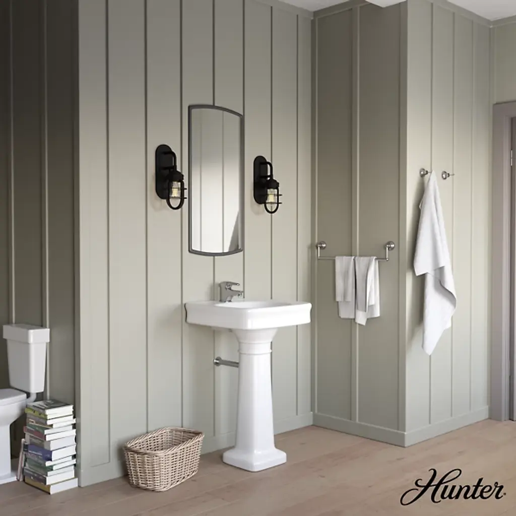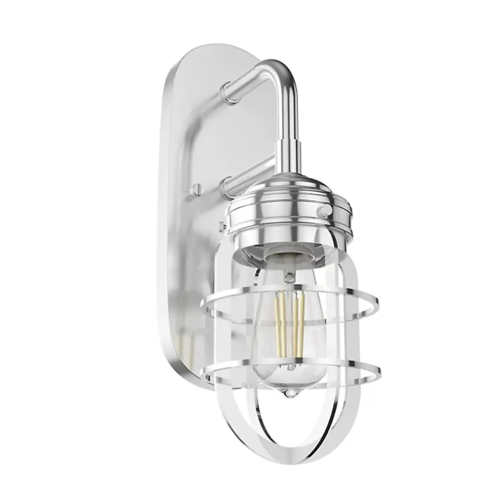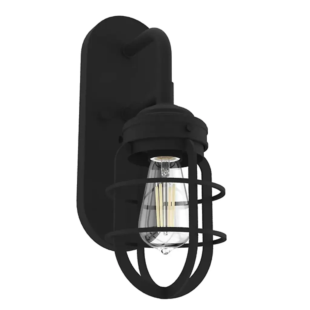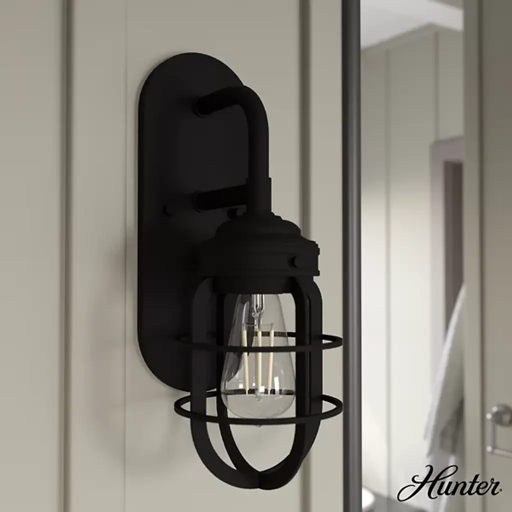 Add an industrial touch to the décor of your modern home with the Starklake Wall Sconce from Hunter Fans. Connecting directly with the wall with a cylindrical mount, this piece is made of smooth metal throughout. The mount extends a pair of slim arms that angle downward, leading to a single downward-facing bulb gently surrounded by a smooth metal enclosure. The light spreads in a warm and even manner, creating a welcoming ambiance in the space.