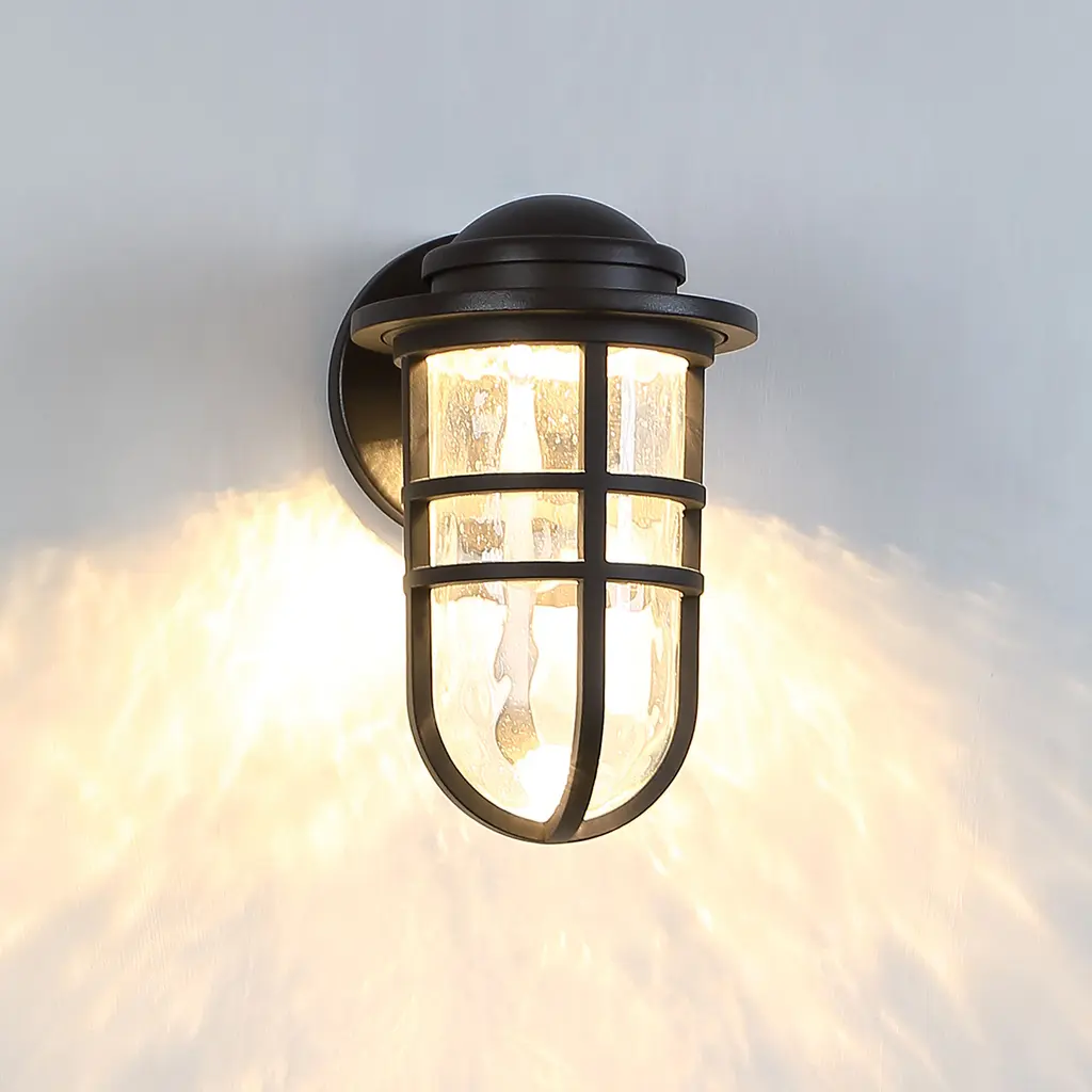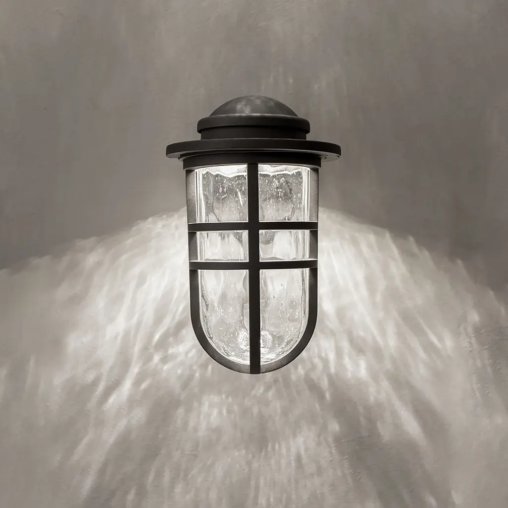 Modern sensibility and vintage looks combine in Steampunk. The die-cast aluminum contrasts with the hammered, seeded and mouth blown glass in this beautiful and powerful outdoor LED wall sconce. Available in aged brass, black bronze and graphite finishes and two sizes, get plenty of use from this Title 24 Compliant and Wet Location Listed product with a Rated Life of up to 80,000 hours.