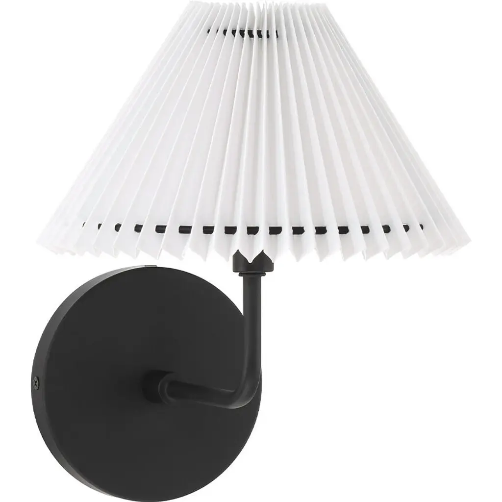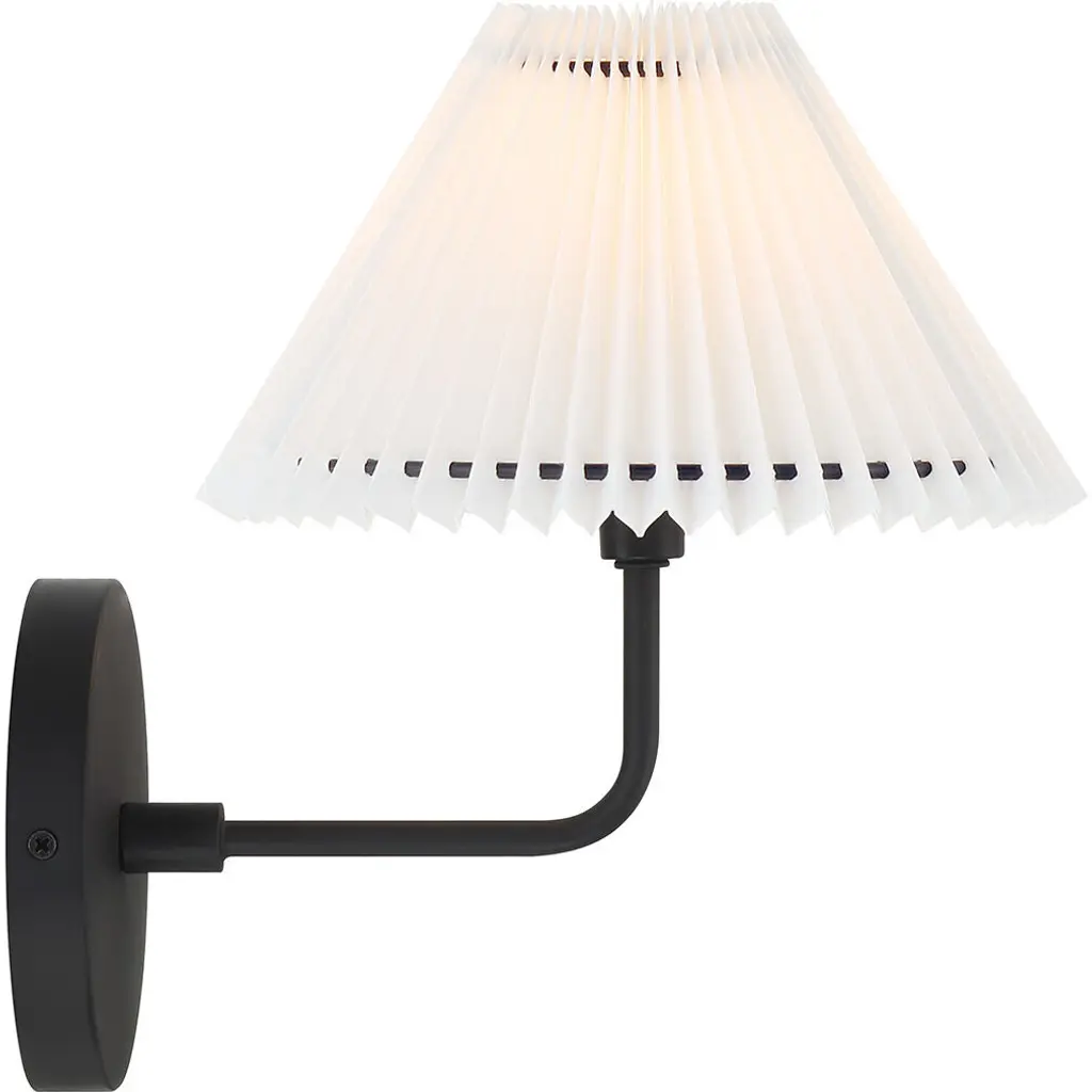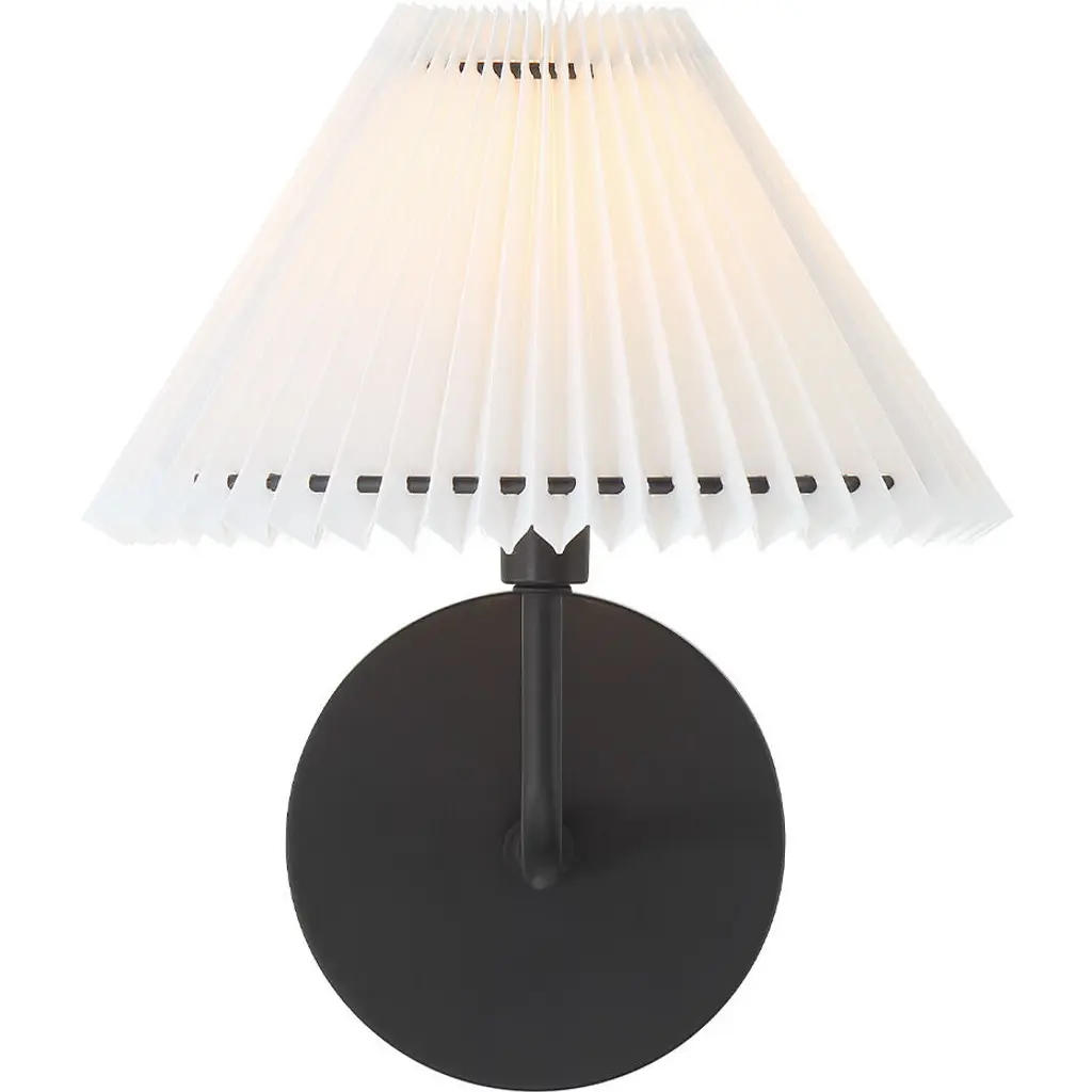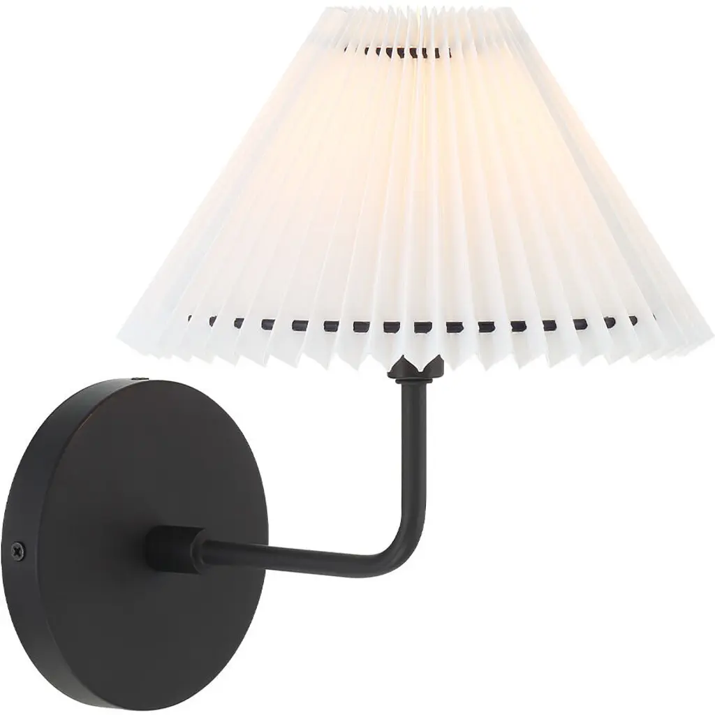 Find a polished and elegant lighting look with this 1-light sconce, which features minimalistic styling and a crisp white pleated fabric shade. Finished in matte black. 10.75" height, 9" width, extends 10.375" from the wall. Uses one candelabra size bulb with a max of 60 watts (not included). Damp area rated.