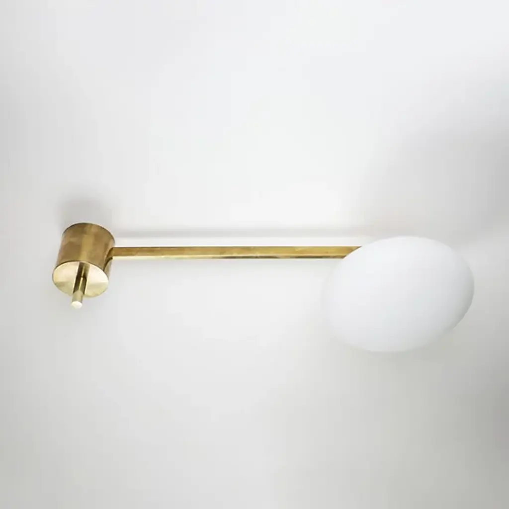 Elegant and divine. The Angel Ceiling / Wall Sconce from Design For Macha is there when you need it as a clean piece with versatile mounting options. Creator Design for Macha puts craftsmanship on full display. Here, the studio draws inspiration from Italian mid-century design. It sports a compact backplate that invites mounting alongside an entryway or atop a living room. Crafted in brass, the metal hardware pleases the eye with its rich finish and crisp geometry. The single arm leads one's gaze to the gorgeous Murano opaline glass globe that appears to float at the end. The globe creates a relaxed tone by filtering a warm aura.