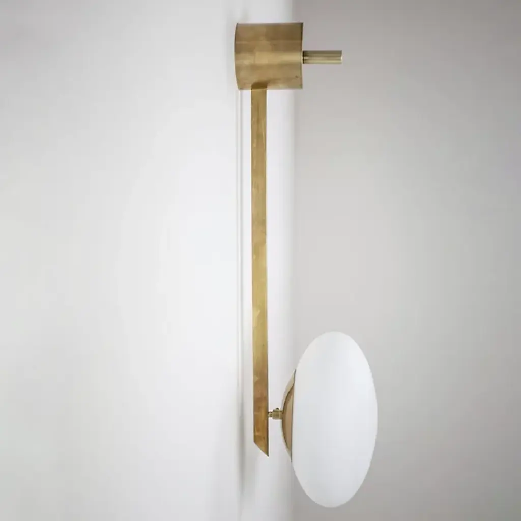 Elegant and divine. The Angel Ceiling / Wall Sconce from Design For Macha is there when you need it as a clean piece with versatile mounting options. Creator Design for Macha puts craftsmanship on full display. Here, the studio draws inspiration from Italian mid-century design. It sports a compact backplate that invites mounting alongside an entryway or atop a living room. Crafted in brass, the metal hardware pleases the eye with its rich finish and crisp geometry. The single arm leads one's gaze to the gorgeous Murano opaline glass globe that appears to float at the end. The globe creates a relaxed tone by filtering a warm aura.