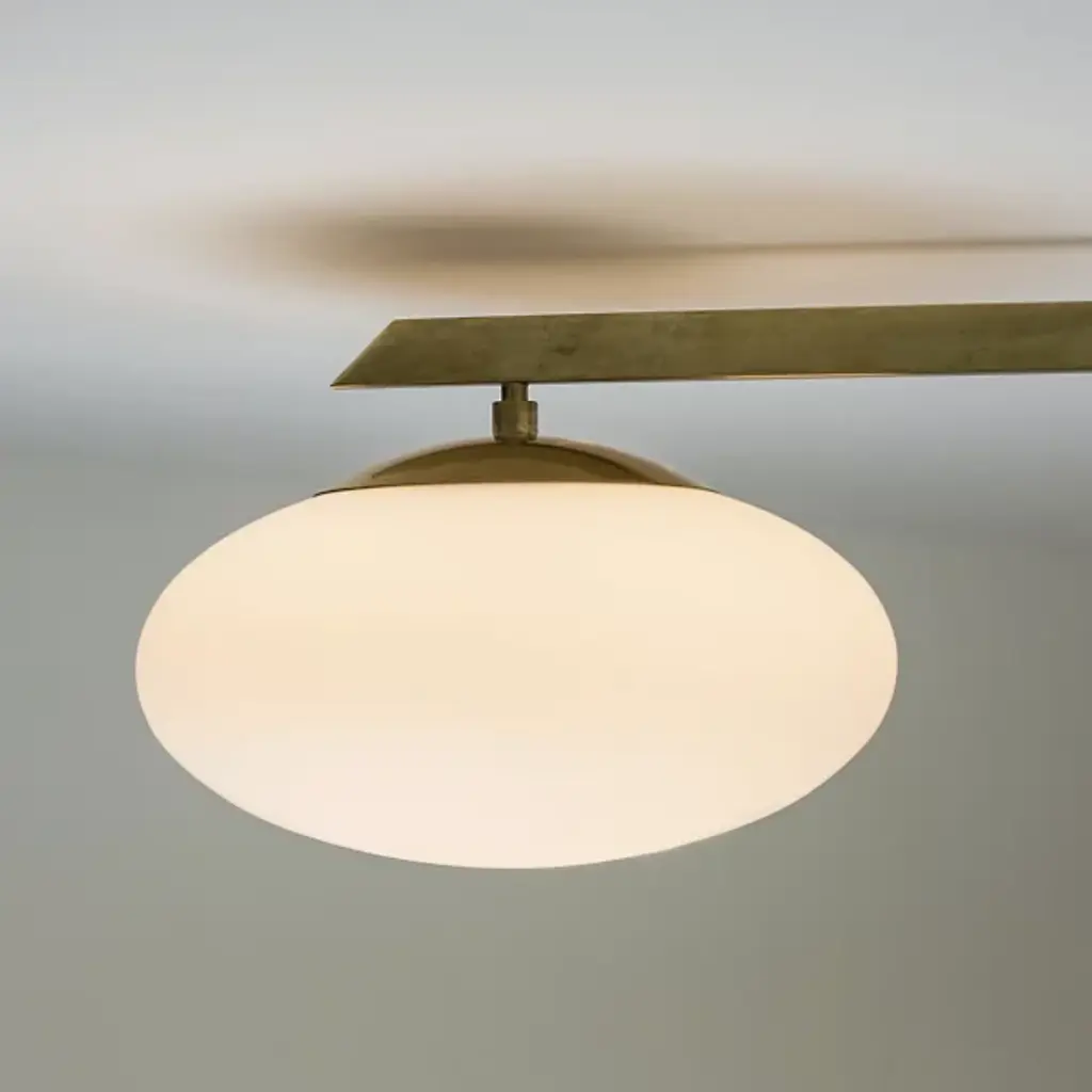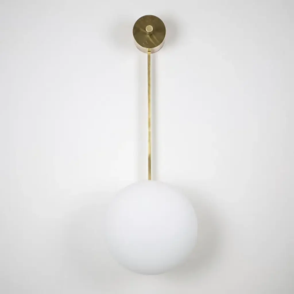 Elegant and divine. The Angel Ceiling / Wall Sconce from Design For Macha is there when you need it as a clean piece with versatile mounting options. Creator Design for Macha puts craftsmanship on full display. Here, the studio draws inspiration from Italian mid-century design. It sports a compact backplate that invites mounting alongside an entryway or atop a living room. Crafted in brass, the metal hardware pleases the eye with its rich finish and crisp geometry. The single arm leads one's gaze to the gorgeous Murano opaline glass globe that appears to float at the end. The globe creates a relaxed tone by filtering a warm aura.