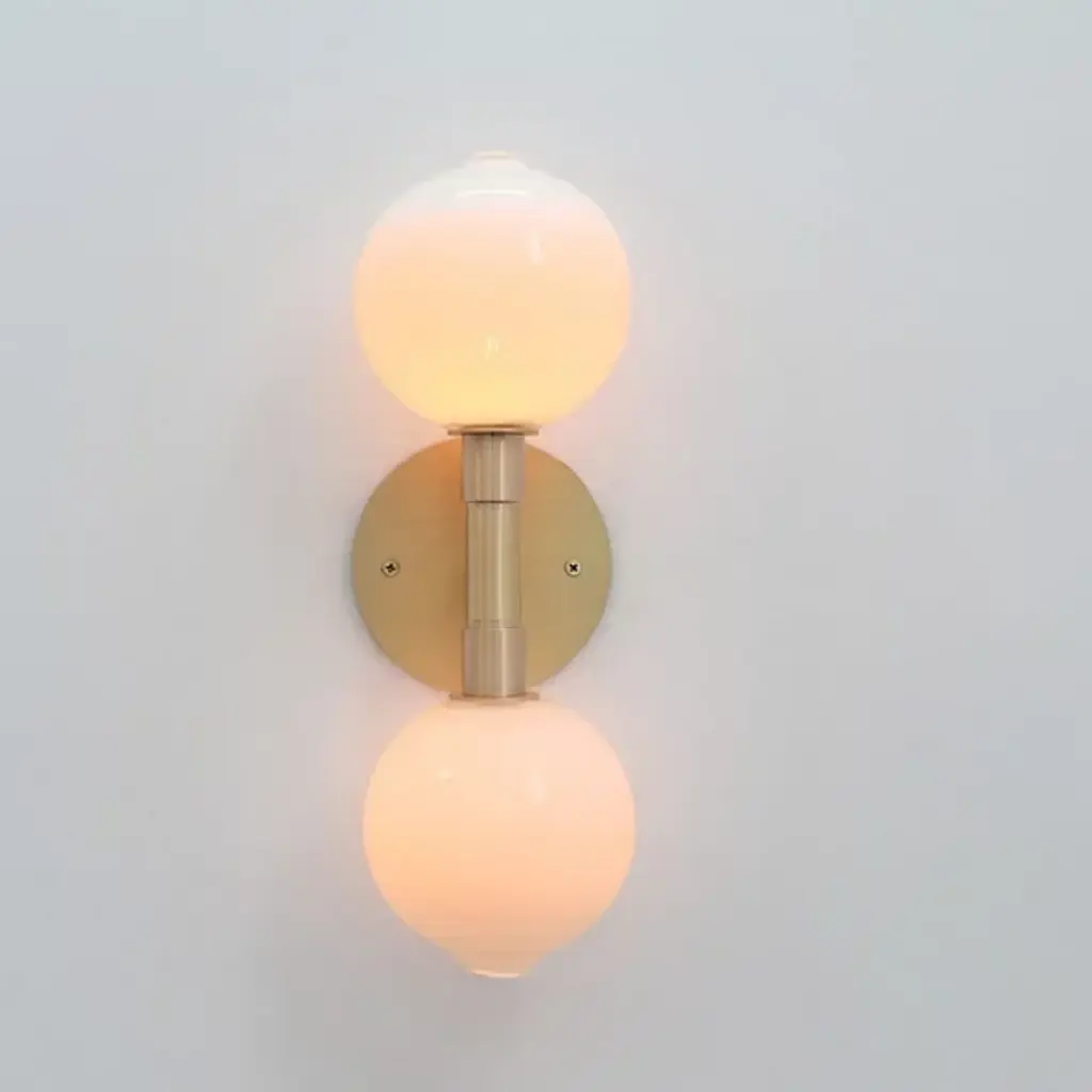 The Stem 2-Light Wall / Flushmount by SkLO is a masterful display of handblown Czech glass set within a minimalistic silhouette. A simple composition that honors honest materials and the craft that shapes them, this design from husband and wife duo Paul Pavlak and Karen Gilbert brings an artful layer of light to spaces. Each glass sphere is individually made and has a double-dipped, fire-polished mouth that is formed when the piece is broken away from the glassblower’s pipe when it is made – a signature that is unique to each glass diffuser produced. Connected by a brass arm and anchored by a round wall plate, this balanced composition can work as either a sconce or ceiling light.