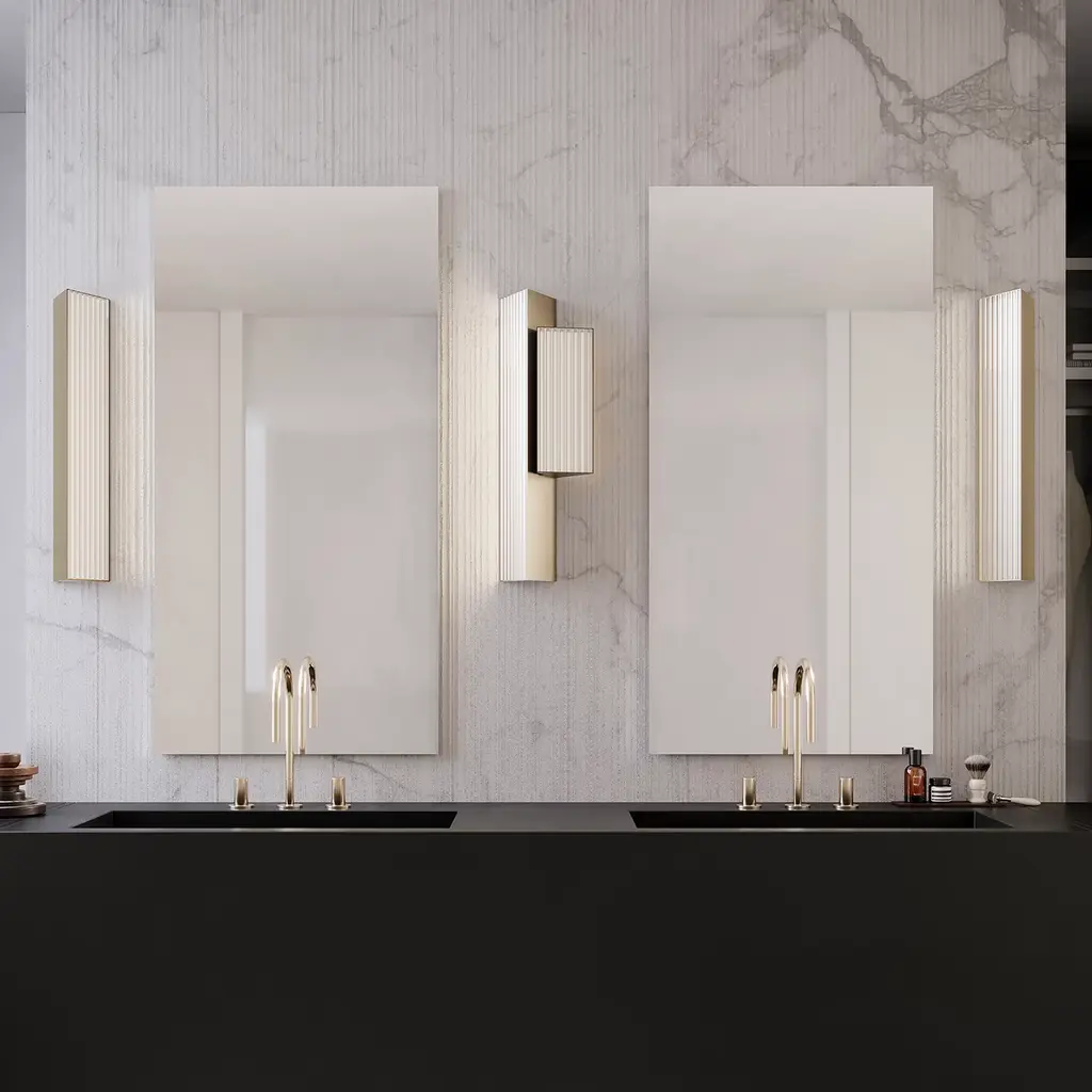 Geometric rigor and a refined satin-golden nickel finish mark the captivating yet quiet character of this sconce. It flaunts an asymmetrical silhouette where the triangle-cut metal volumes housing the light sources and making up the frame are coupled with Plexiglas shades showcasing a sophisticated ridged texture. More designs from the Stick Collection can be explored in the Artemest catalog.