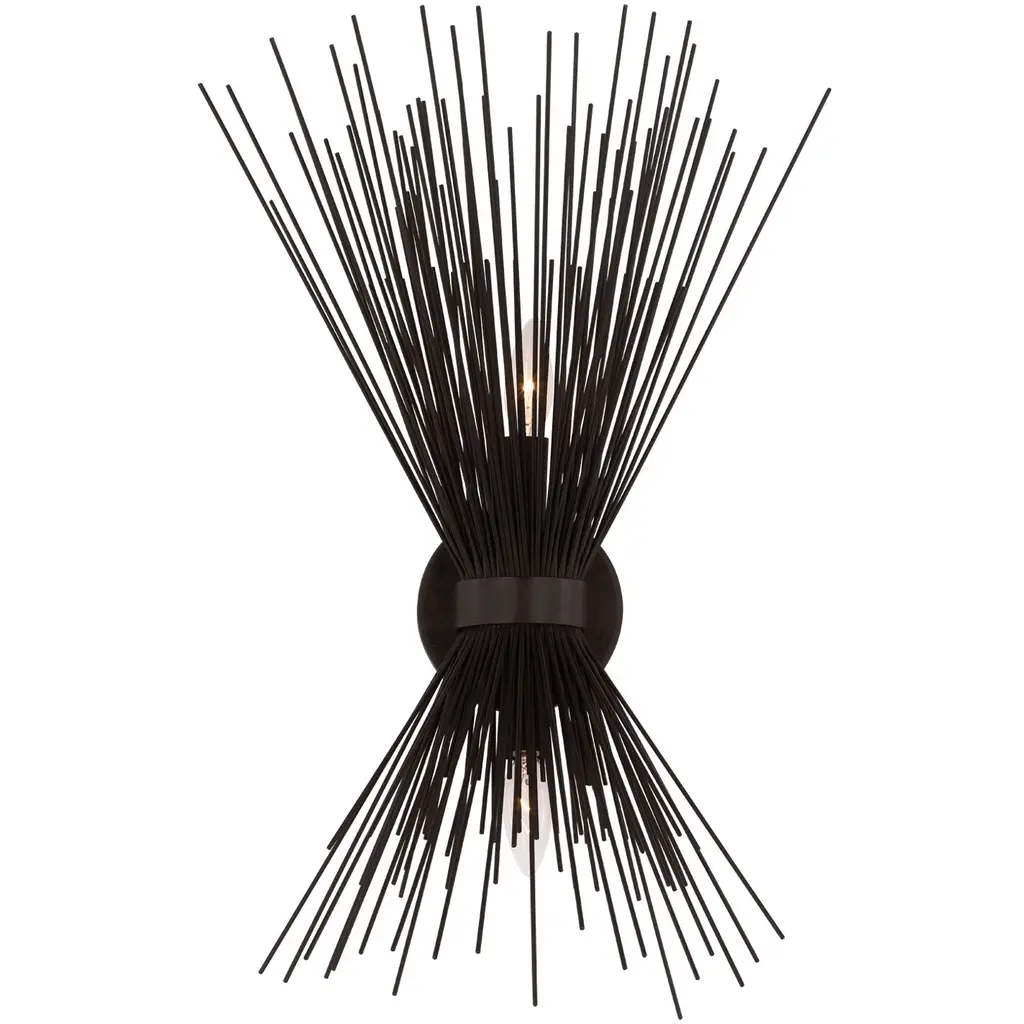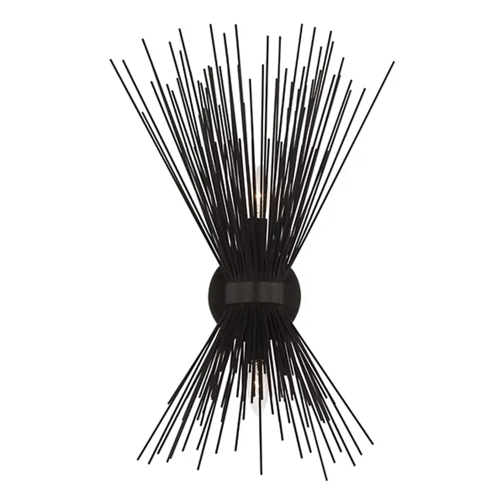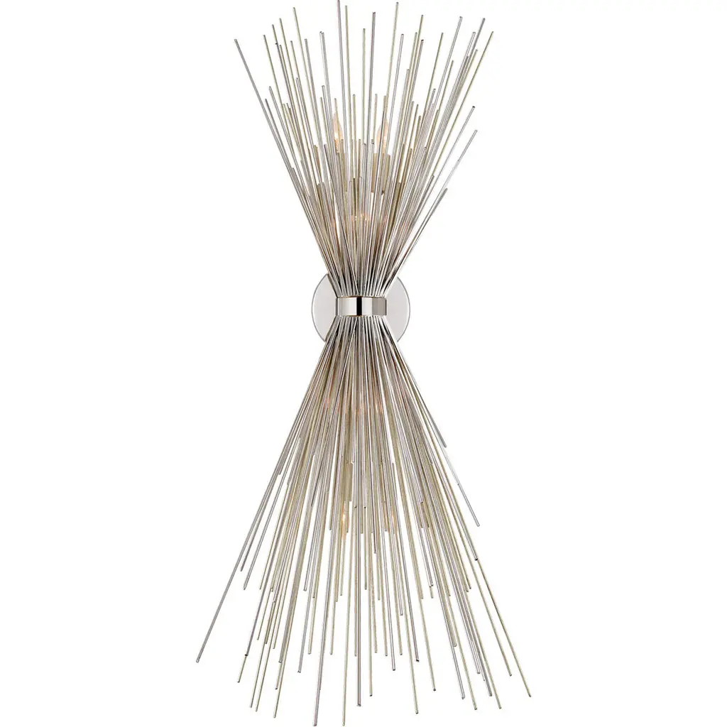 Designed by Kelly Wearstler, the Strada Wall Sconce from Visual Comfort Signature is a sculptural reference to lively organic forms, exciting the eyes with its radiant quality. The sconce brings visual impact to tight spaces through its compact circular backplate. The ring in front cinches up the slender rod accents for a silhouette evocative of a bundle of hay. The asymmetric rods subtly conceal the lamping to minimize glare. Creating a graphic silhouette, the rods fan out a cozy glow on the nearby wall.