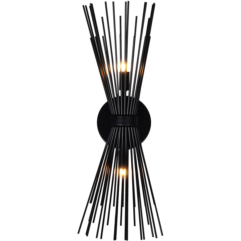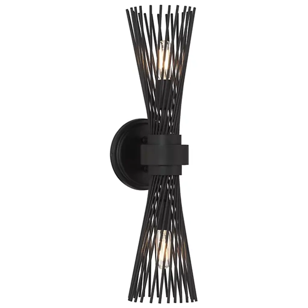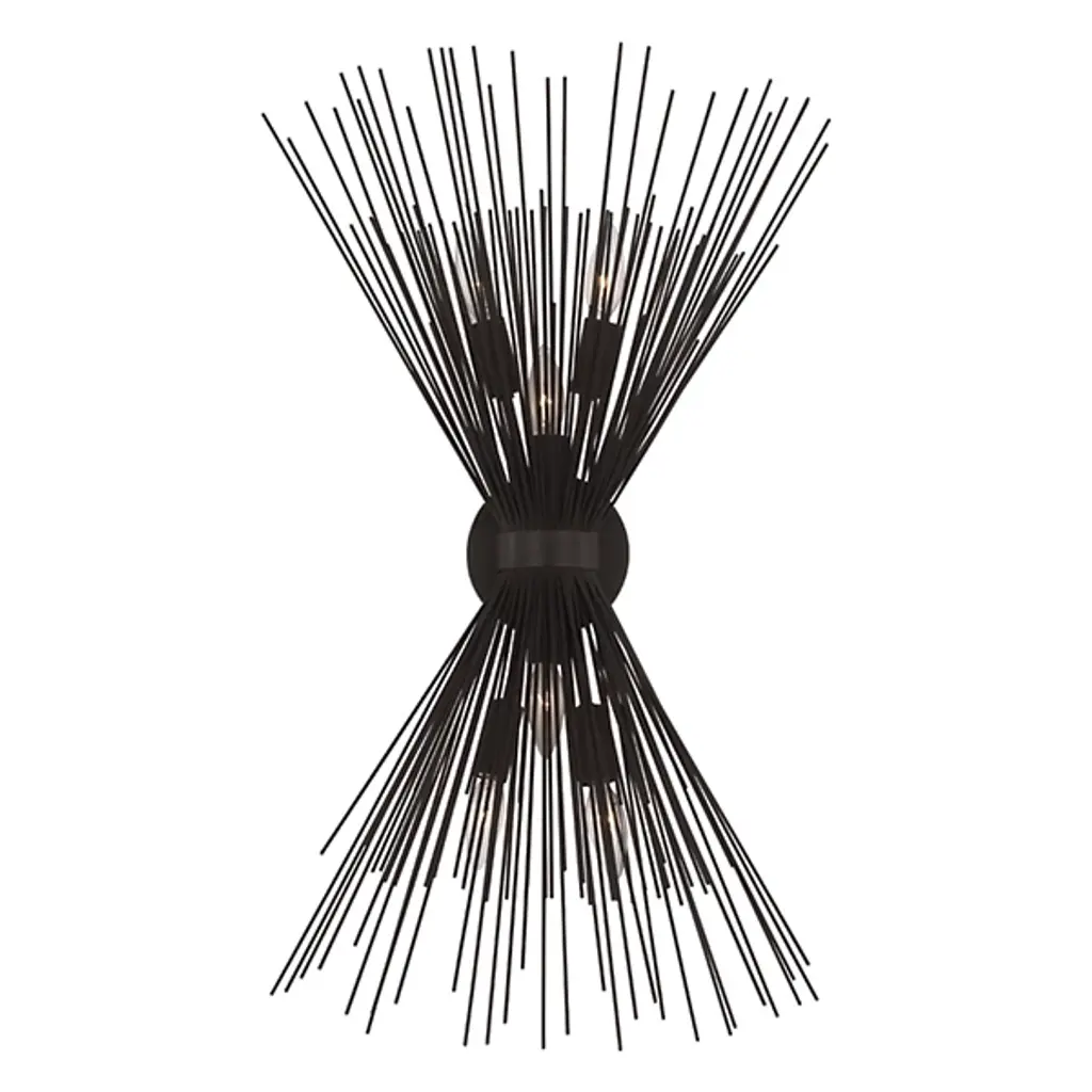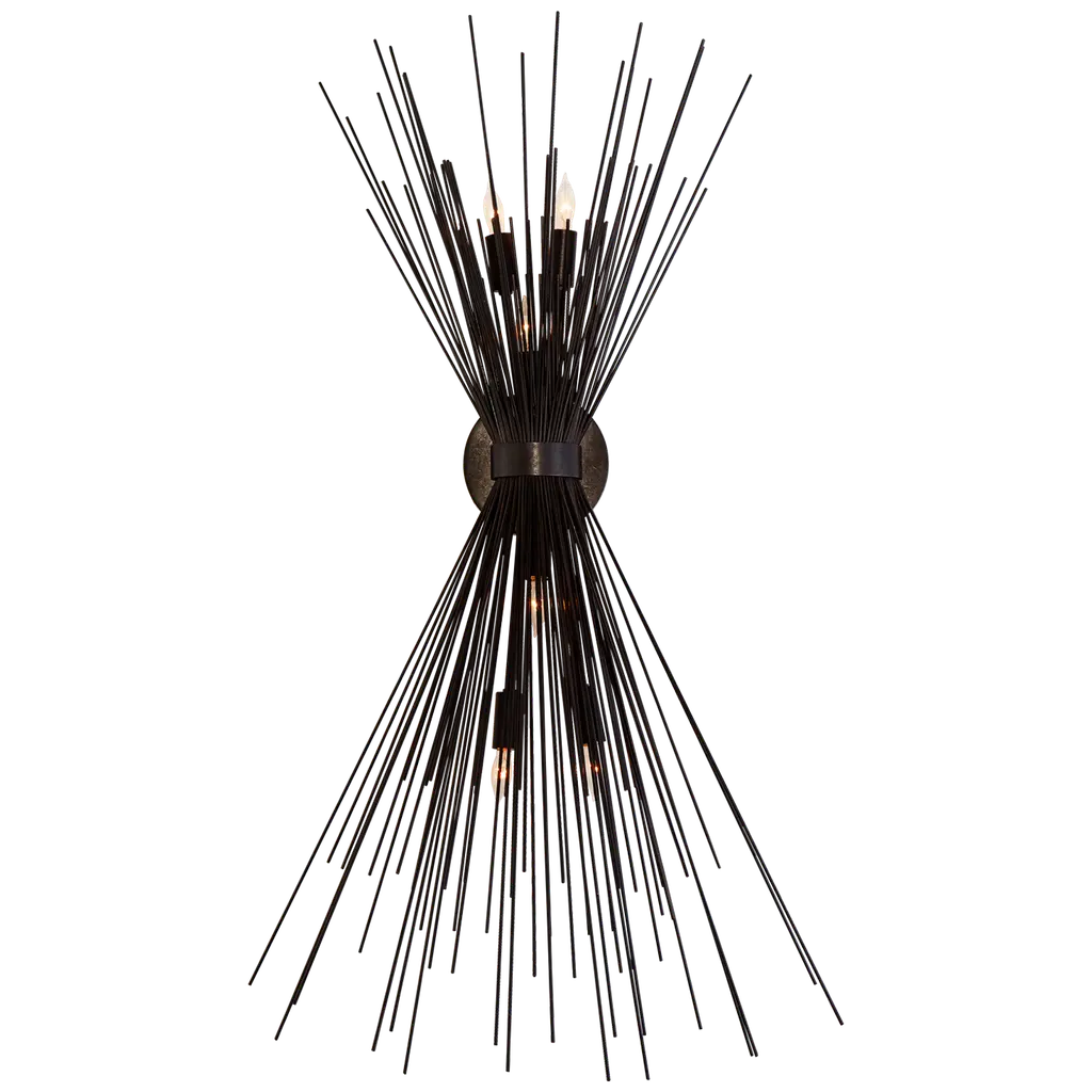 Designed by Kelly Wearstler, the Strada Wall Sconce from Visual Comfort Signature is a sculptural reference to lively organic forms, exciting the eyes with its radiant quality. The sconce brings visual impact to tight spaces through its compact circular backplate. The ring in front cinches up the slender rod accents for a silhouette evocative of a bundle of hay. The asymmetric rods subtly conceal the lamping to minimize glare. Creating a graphic silhouette, the rods fan out a cozy glow on the nearby wall.