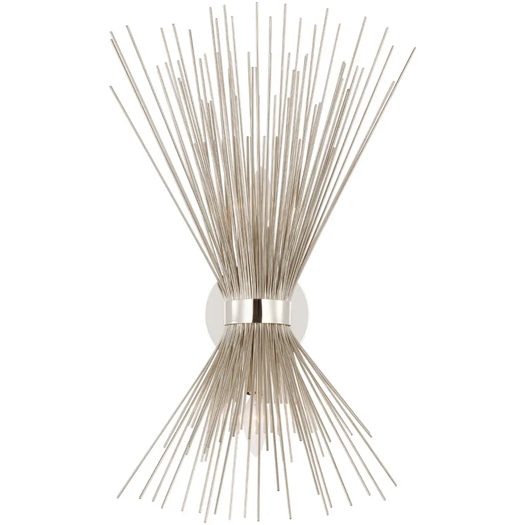 Designed by Kelly Wearstler, the Strada Symmetrical Wall Sconce from Visual Comfort Signature is a delicate yet dynamic functional sculpture, serving as an homage to organic forms. The sconce’s compact backplate is a great choice atop a column or lined up across a living space. Its ring accent produces a series of lamp holders that rest behind quill-like accents to lessen glare. The linear accents spread out uniformly at the top and bottom to create an expressive silhouette that fans soft ambient light.