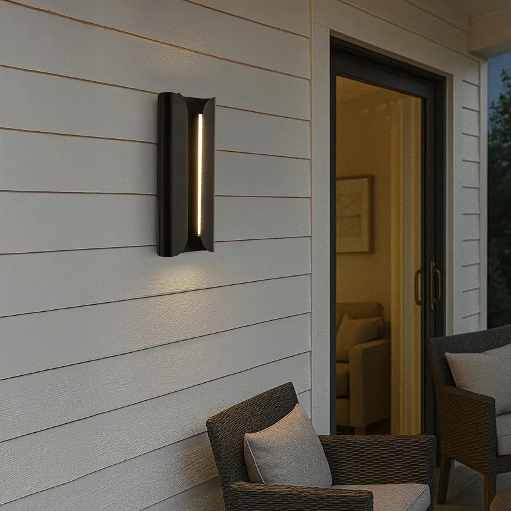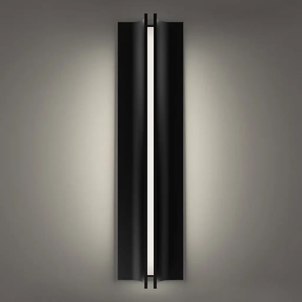 The Strait Outdoor LED Wall Sconce from Modern Forms positions two angled aluminum plates with a white etched diffuser separating them to create clean geometric light distribution. The angular plates direct LED illumination outward in controlled patterns while the etched center section softens harsh lighting transitions. Color temperature selection allows adjustment for different times of day or seasonal preferences. The geometric composition emphasizes angular precision while maintaining weather-resistant construction for outdoor environments. Front and ambient illumination modes provide versatile lighting options for different exterior applications and architectural contexts.