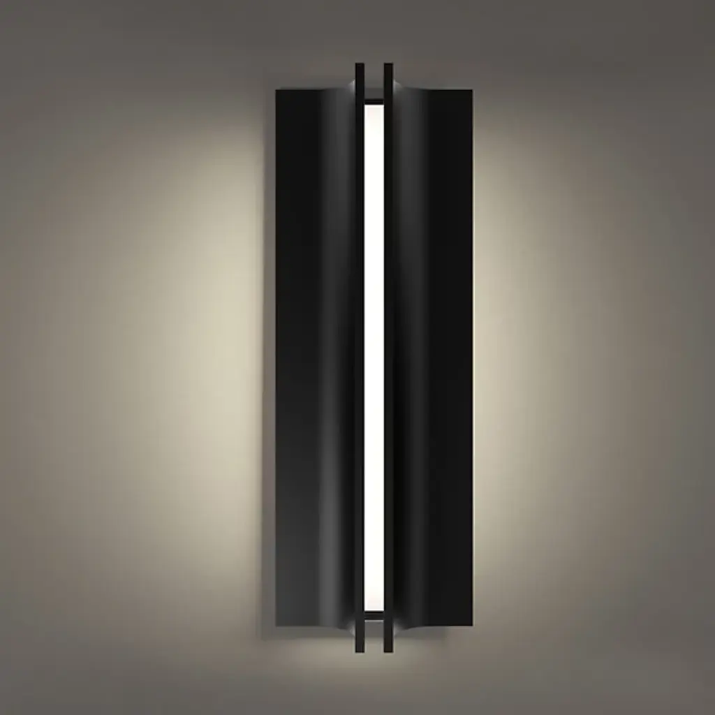The Strait Outdoor LED Wall Sconce from Modern Forms positions two angled aluminum plates with a white etched diffuser separating them to create clean geometric light distribution. The angular plates direct LED illumination outward in controlled patterns while the etched center section softens harsh lighting transitions. Color temperature selection allows adjustment for different times of day or seasonal preferences. The geometric composition emphasizes angular precision while maintaining weather-resistant construction for outdoor environments. Front and ambient illumination modes provide versatile lighting options for different exterior applications and architectural contexts.