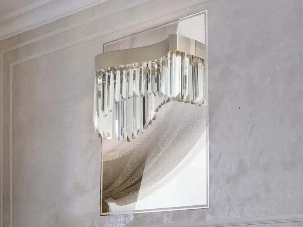 Strata - captures the energy of light. Sculptural reversible linear sconce featuring LED illuminated hand-carved crystals. Shown in our Standard Silver Leaf finish. Can be mounted vertically or horizontally.