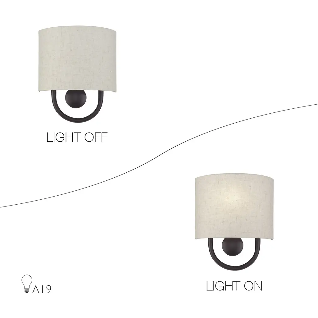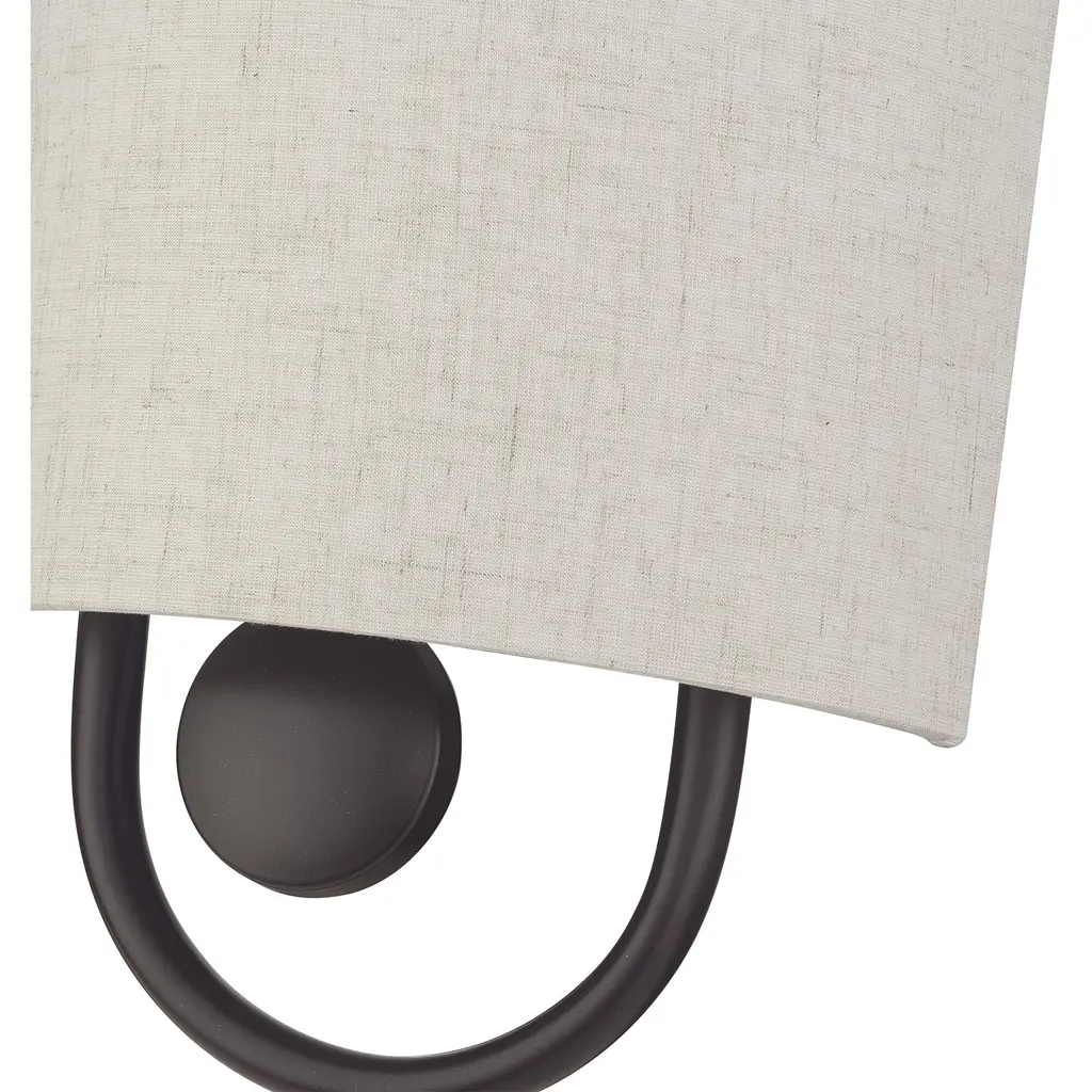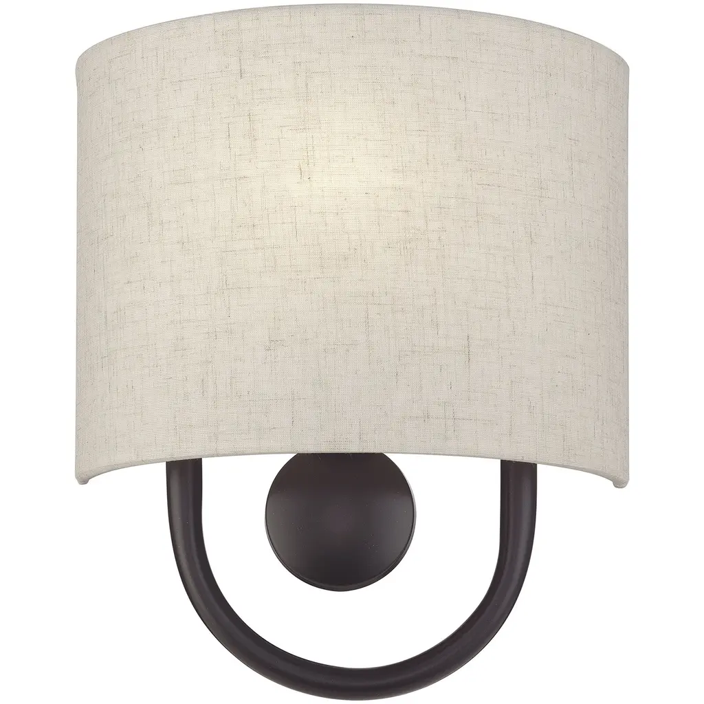 Raise the style bar with the designer Stratton ADA wall sconce in a handsome, versatile and contemporary manner. This single light wall sconce comes in an English bronze finish with a curved oatmeal fabric hardback shade.