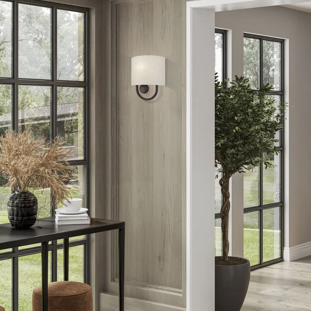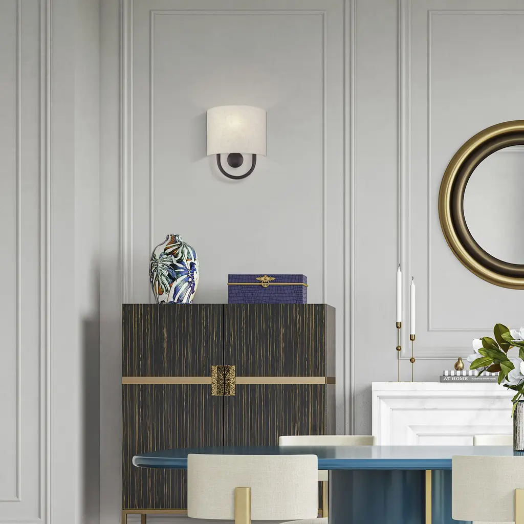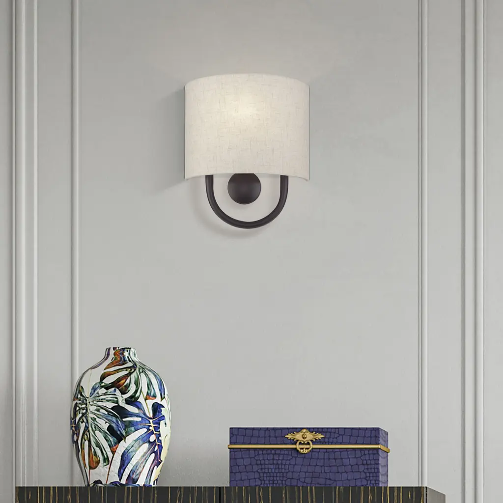 Raise the style bar with the designer Stratton ADA wall sconce in a handsome, versatile and contemporary manner. This single light wall sconce comes in an English bronze finish with a curved oatmeal fabric hardback shade.