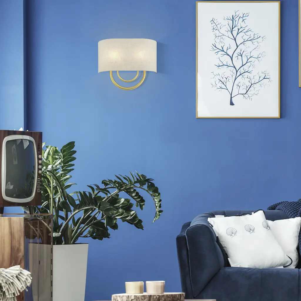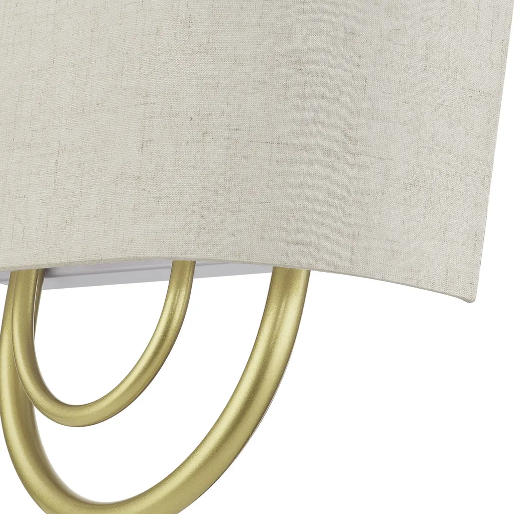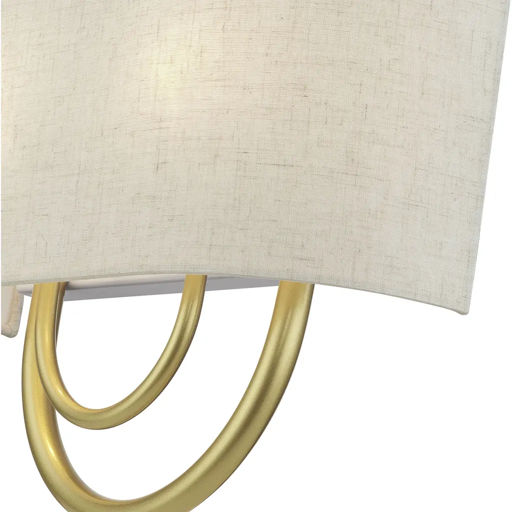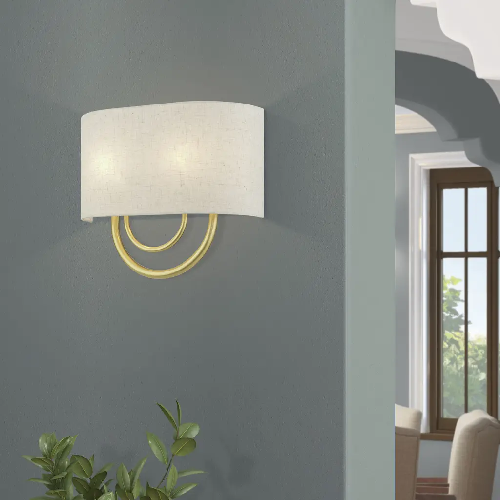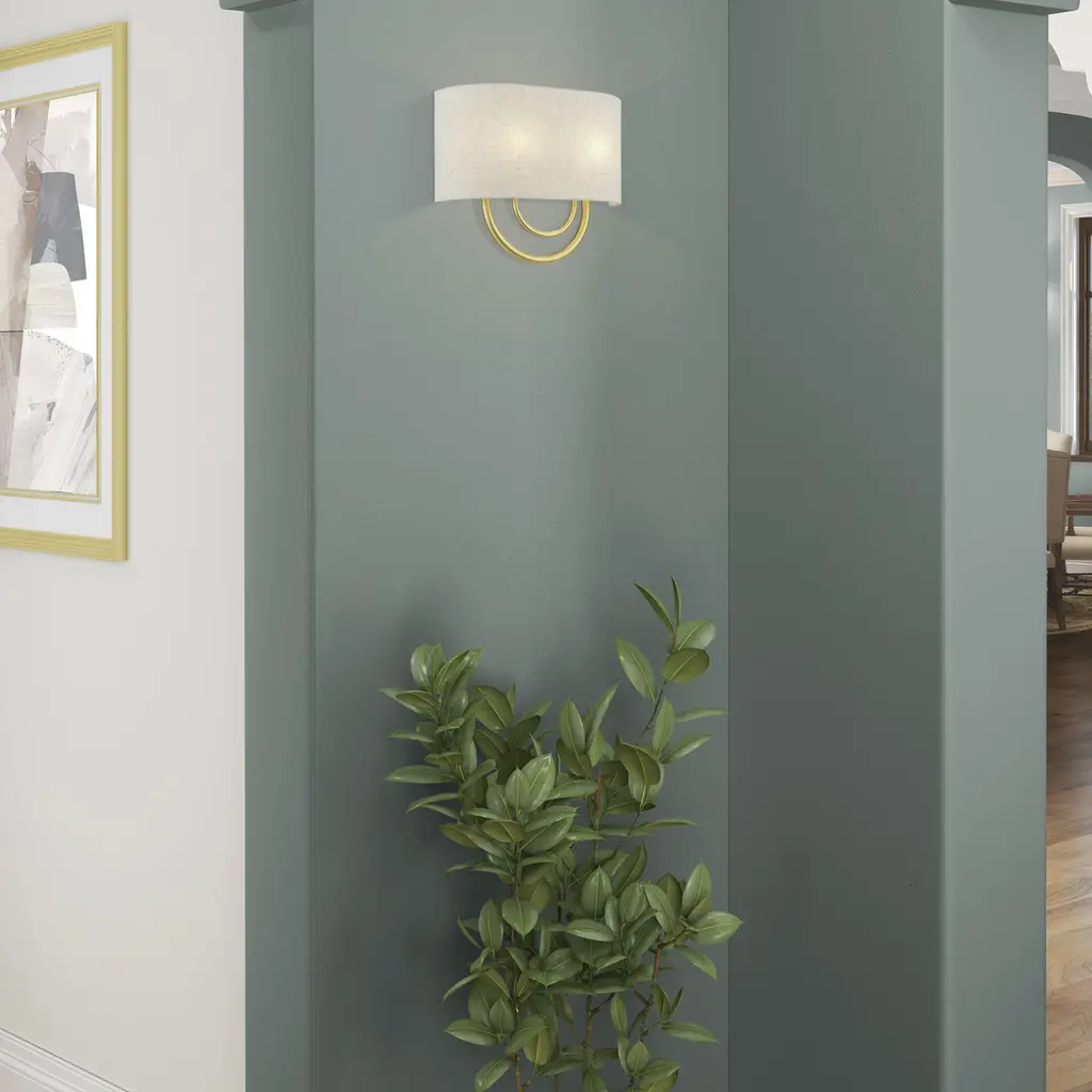 Raise the style bar with the designer Stratton ADA wall sconce in a handsome, versatile and contemporary manner. This single light wall sconce comes in a soft gold finish with a curved oatmeal fabric hardback shade.