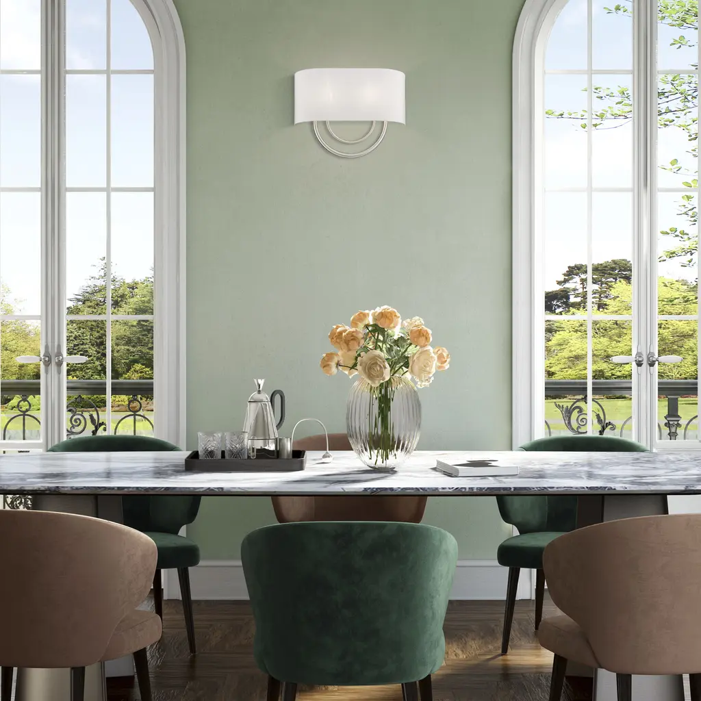 Raise the style bar with the designer Stratton ADA wall sconce in a handsome, versatile and contemporary manner. This single light wall sconce comes in a brushed nickel finish with a curved off white fabric hardback shade.