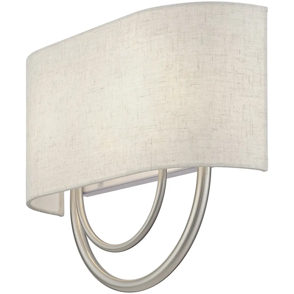 Raise the style bar with the designer Stratton ADA wall sconce in a handsome, versatile and contemporary manner. This single light wall sconce comes in a brushed nickel gold finish with a curved oatmeal fabric hardback shade.