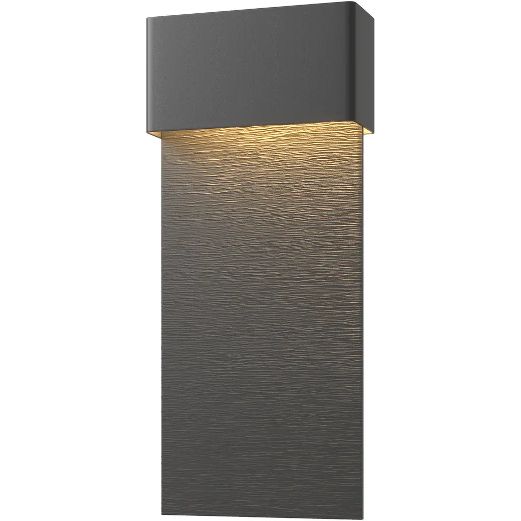 Long in length, the beautifully textured aluminum backplate guides the light downward from the LED illumination, hidden within the header element. Stylish and elegant, the Stratum Dark Sky Friendly Outdoor Sconce features a two-tone finish option. Starlit night skies come into focus with the Stratum, built specifically to reduce light pollution while enhancing the beauty of any exterior.