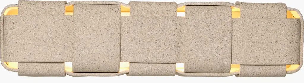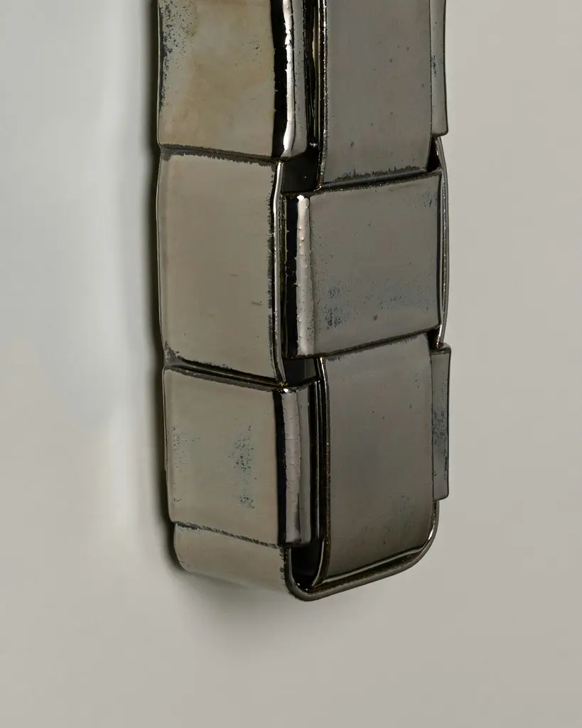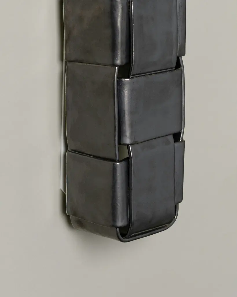 Brooklyn ceramicist Virginia Sin's sculptural Stria 5 Sconce (2025) finds its rhythm in the ancient practice of weaving, where quiet poetry emerges through repetition. Hand-placed ceramic strips form a delicate lattice of light and shadow, their obsidian glaze catching illumination with mesmerizing depth. This study in tension and restraint casts a soft glow that adds gentle texture to any space, whether defining a reading nook or creating architectural interest along a hallway. Sin's studio champions "putting the fun into the functional" - evident in the sconce's sophisticated interplay of form and light. Made in the USA.