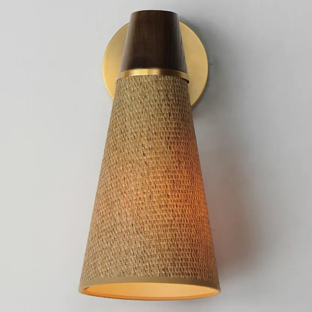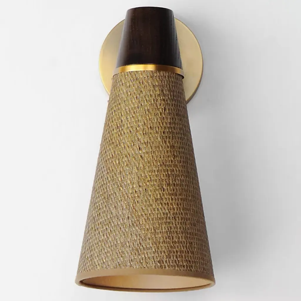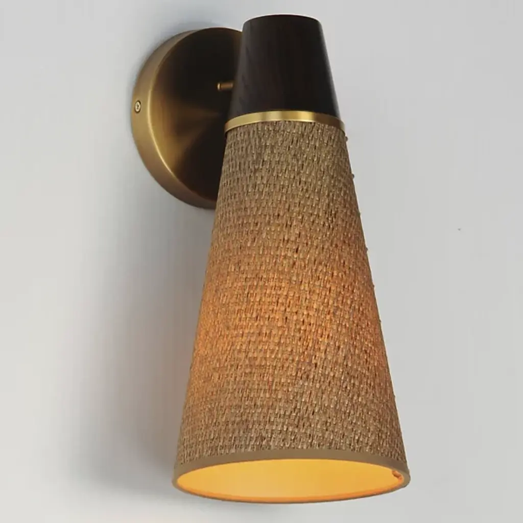 Transport yourself to an island getaway with the Sumatra Wall Sconce from Maxim Lighting. This exquisite fixture features a stained grasscloth shade meticulously stitched with corresponding laces, creating a captivating visual texture that adds a touch of artisanal elegance to any space. It features a solid wood housing. Illuminate your living spaces with the soothing glow of an LED. The eye is drawn to this fixture's conical shape. It is supported by a bookplate for stability.