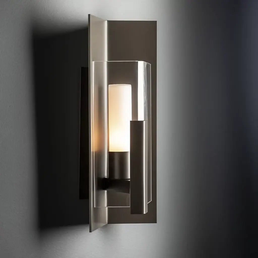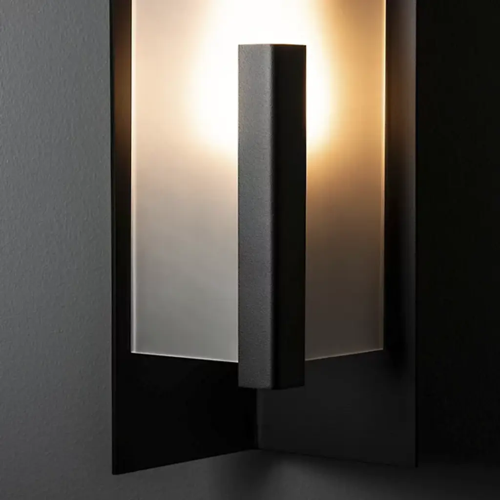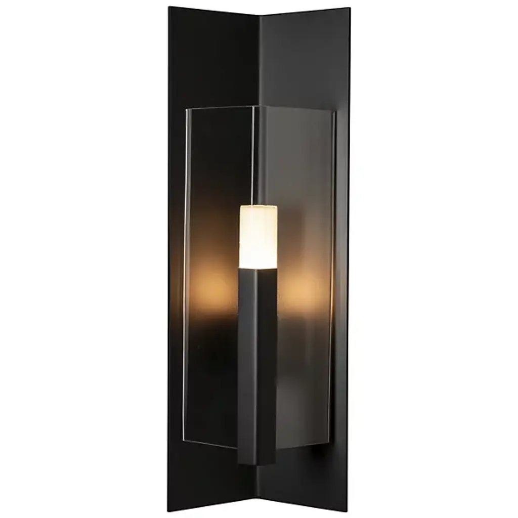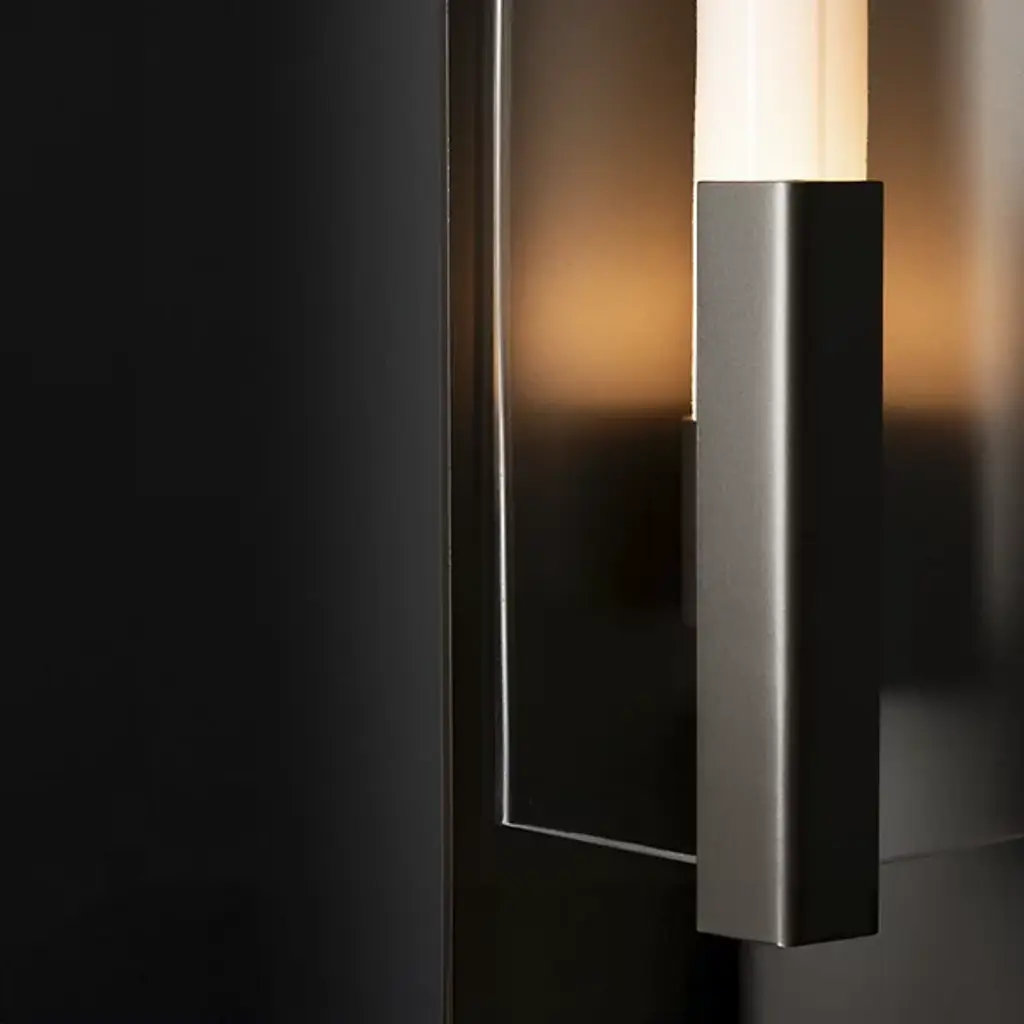 Introducing the Hubbardton Forge's Summit Outdoor Wall Sconce, an embodiment of craftsmanship and sophistication. This handcrafted piece showcases a rectangular steel frame suspended from a prominent wall mount, housing a glass lantern shade. Embracing traditional aesthetics with a touch of transition, this beautiful sconce is designed with an inner opal diffuser to cast a warm, inviting light onto your outdoor spaces. Ideal for enhancing entrance ways or outdoor patios for a welcoming ambiance.