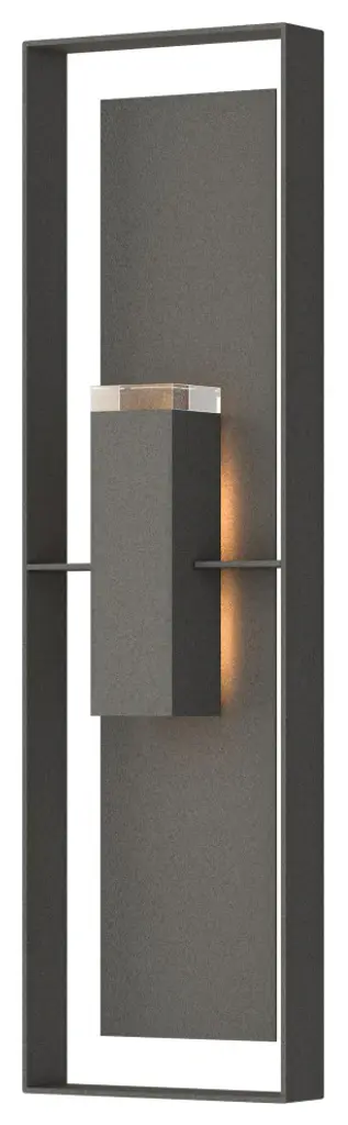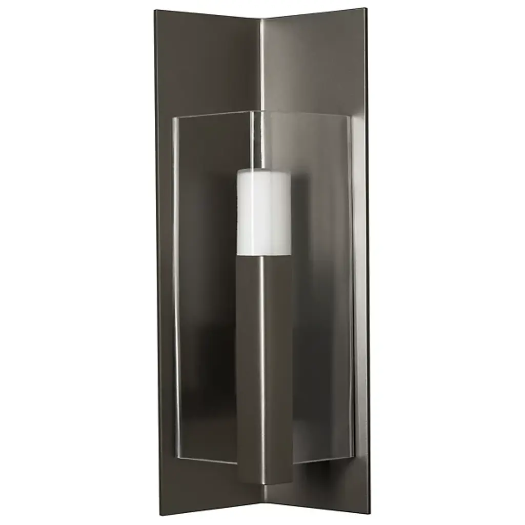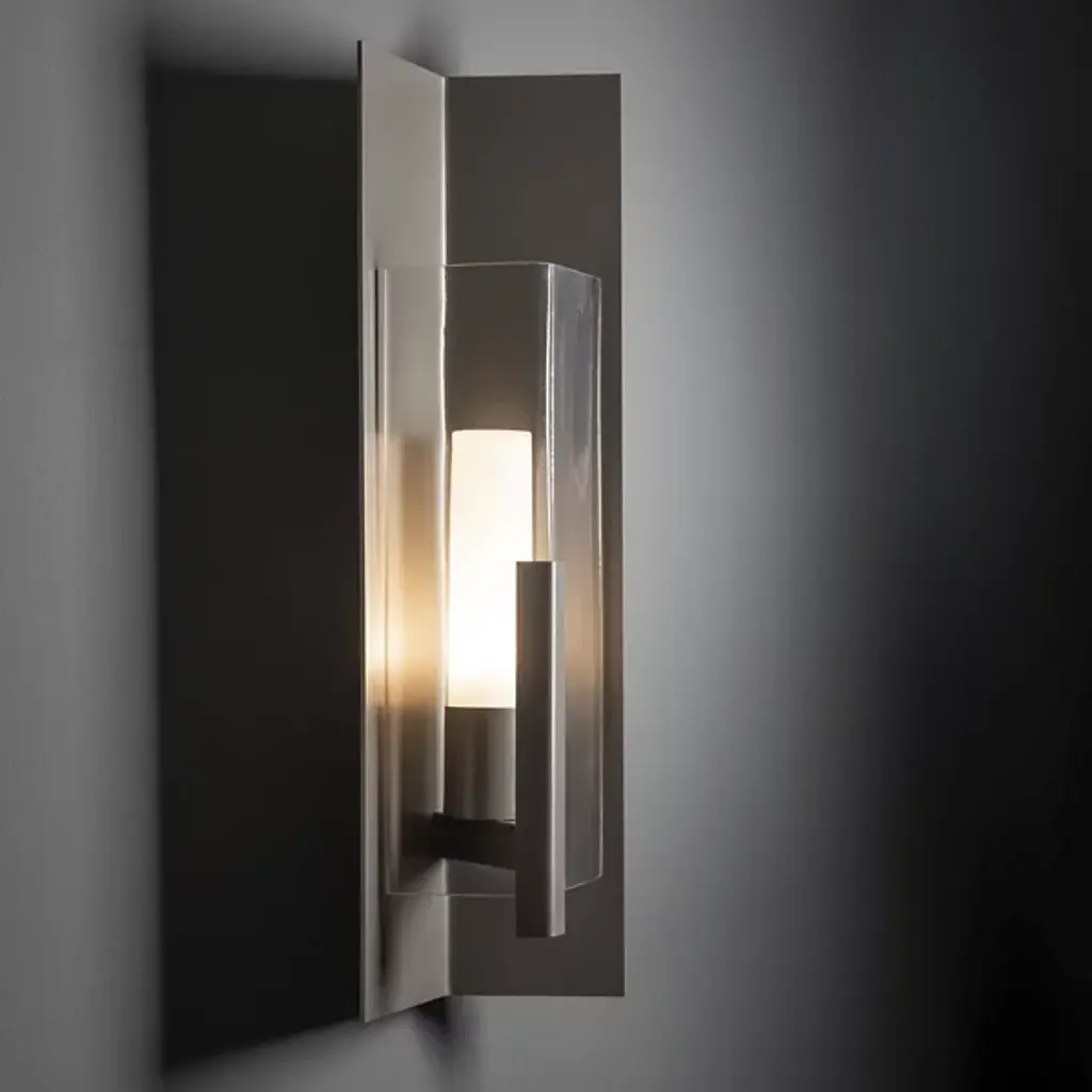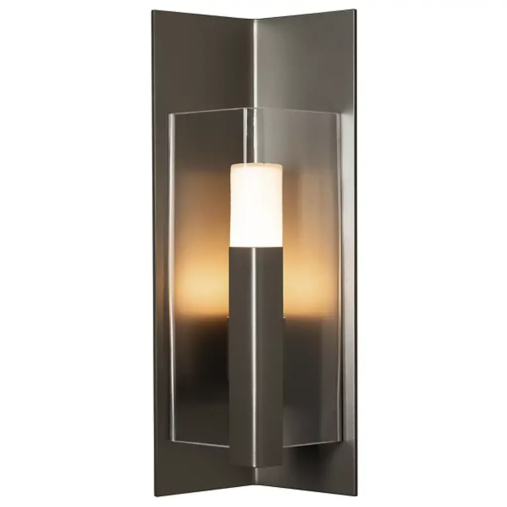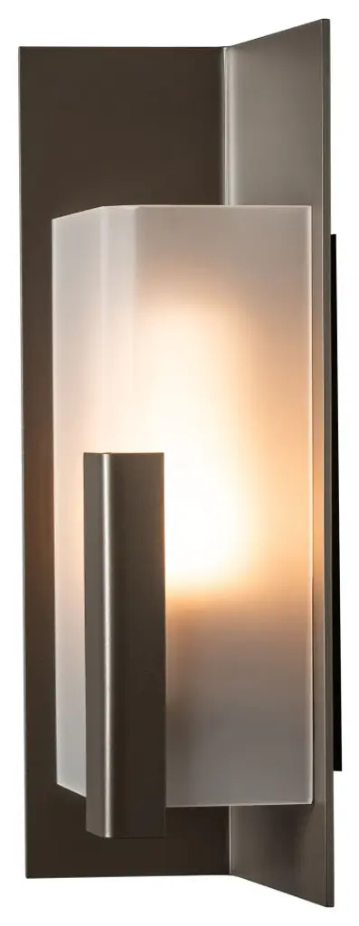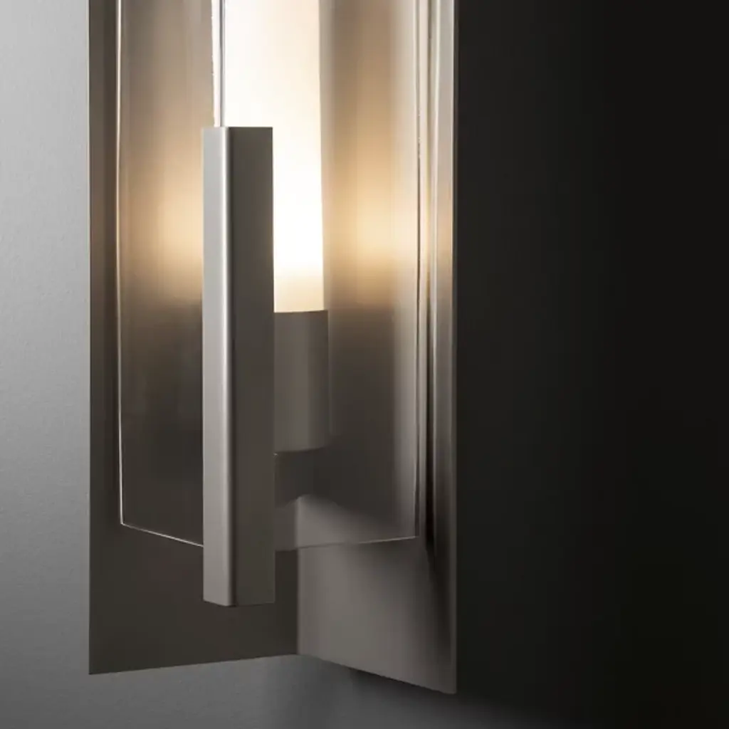 Introducing the Hubbardton Forge's Summit Outdoor Wall Sconce, an embodiment of craftsmanship and sophistication. This handcrafted piece showcases a rectangular steel frame suspended from a prominent wall mount, housing a glass lantern shade. Embracing traditional aesthetics with a touch of transition, this beautiful sconce is designed with an inner opal diffuser to cast a warm, inviting light onto your outdoor spaces. Ideal for enhancing entrance ways or outdoor patios for a welcoming ambiance.