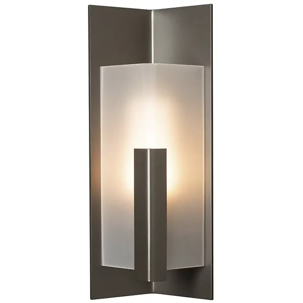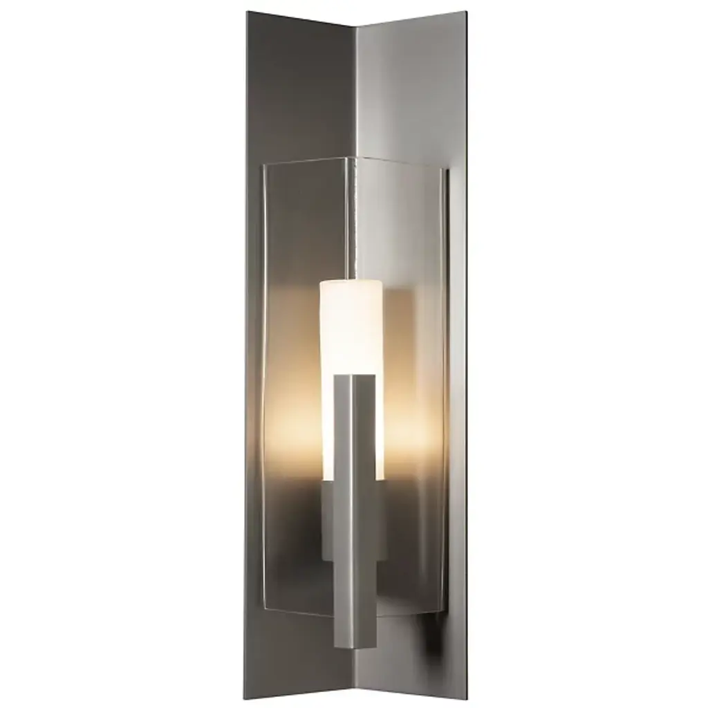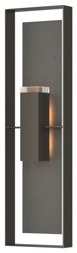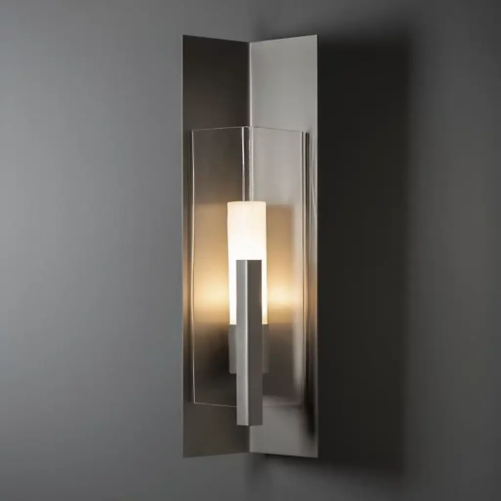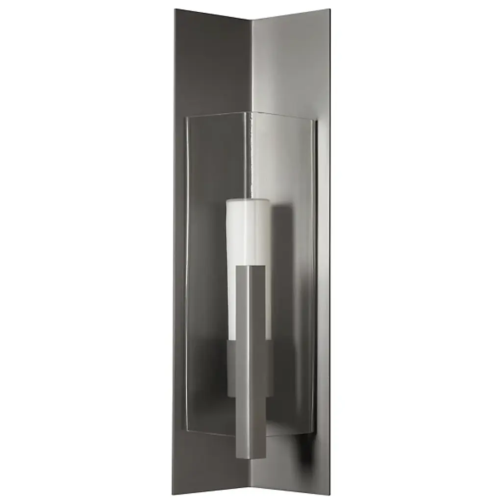 Introducing the Hubbardton Forge's Summit Outdoor Wall Sconce, an embodiment of craftsmanship and sophistication. This handcrafted piece showcases a rectangular steel frame suspended from a prominent wall mount, housing a glass lantern shade. Embracing traditional aesthetics with a touch of transition, this beautiful sconce is designed with an inner opal diffuser to cast a warm, inviting light onto your outdoor spaces. Ideal for enhancing entrance ways or outdoor patios for a welcoming ambiance.
