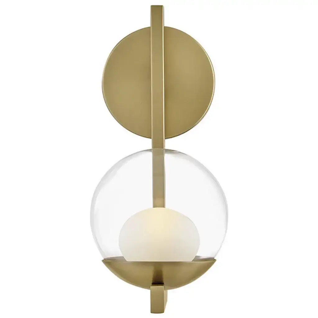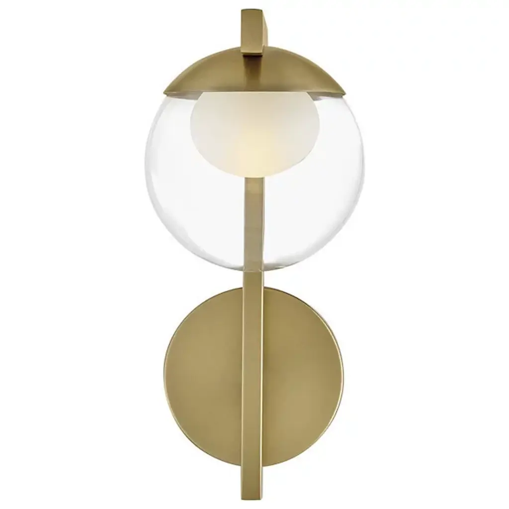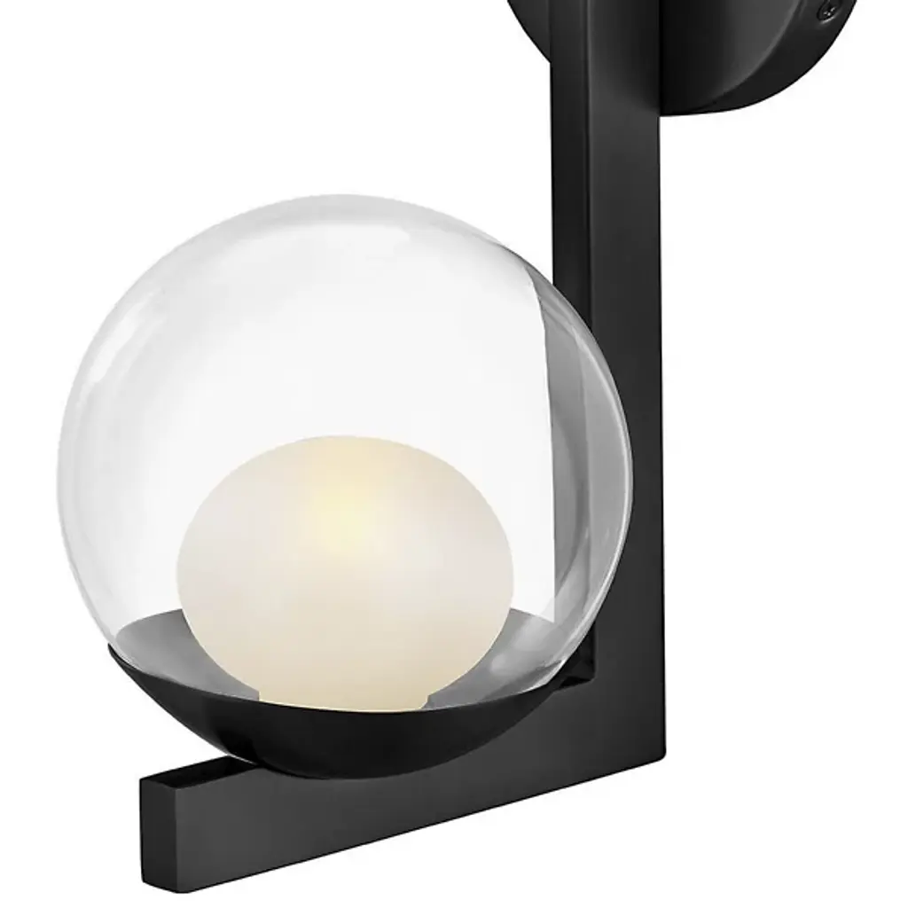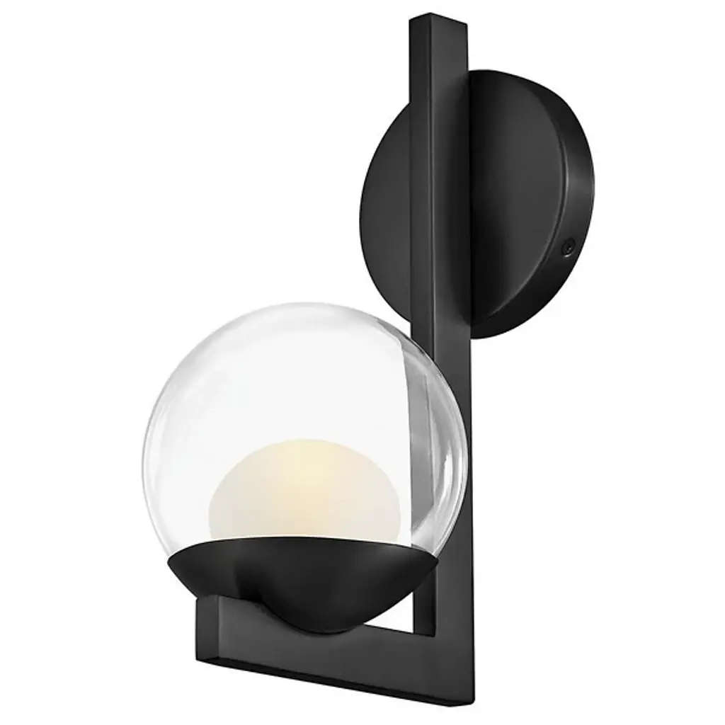 The Sunni Bath Wall Sconce from Hinkley adds a layered mix of angularity and rounded natural shapes to indoor walls. Secured by a circular wall plate, it utilizes a right-angled steel arm to support a strong, damp-listed lamp, which is elevated by a metal dish inside a translucent shade. A clear glass bubble surrounds the smaller inner shade, adding artistic appeal and dispensing a layered ambiance that layers evenly across its environment.