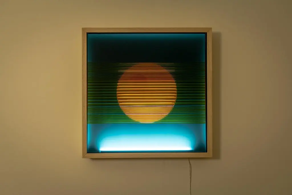 Sunno wall light by Studio LampentDimensions: D 53 x W 53 x H 8 cmMaterials:Acrylic sheets, acrylic rods, wood. Weight: 6 kg.Customizable frame wood type (oak, ash, birch, etc) and color.All our lamps can be wired according to each country. If sold to the USA it will be wired for the USA for instance."Sunno is an abstract geometric light artwork, purposed to be used as an atmospheric luminaire. As light is geometrically diffused through the multi-layered acrylic structure, different color gradients occur, creating a sunset-mimicking effect."Studio Lampent is a Sweden based lighting design and artistic studio, founded and driven by Stavros Kotsakis since 2011. The name Lampent is the conjunction of the words lamp and lambent and describes our main goal: to create lighting products with a playful radiance.With the purpose to explore the endless adventures of light while interacting with fascinating materials, we are dedicated in designing series of exclusive handcrafted luminaires which add a genuine warmth to a wide range of interiors. Putting light into the center point of the development process allows the creative journey from form to function to happen. Becoming itself part of symmetrical structures or transformed objects, light is being naturally turned into a basic element for geometry.