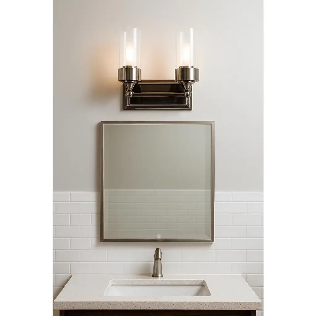 Sunset Lighting Esquire Wall Sconce, 2-Light, Antique Gunmetal Elegant transitional wall sconce in an Antique Gunmetal finish with clear glass shades. Uses incandescent bulbs for bright, classic illumination; requires 2 × 100W medium-base bulbs (sold separately). Key Features • Antique Gunmetal finish for a refined, vintage look • Clear glass cylinder shades showcase the bulbs • Dimmable with compatible switch (sold separately) • Ideal for bathrooms and other indoor spaces Specifications Brand: Sunset Lighting Color: Antique Gunmetal Material: Metal Style: Modern Light Fixture Form: Sconce Room Type: Bathroom Power Source: Corded Electric Light Source Type: Incandescent Finish Type: Gunmetal Finish Shade Material: Glass Number of Light Sources: 2 Included Components: Light fixture Number of Items: 1 Manufacturer: Luminance Part Number: F17102-57 Item Weight: 4.18 lb Product Dimensions: 12" × 11.8" × 12" Country of Origin: China Item Model Number: F17102-57 Size: 2-Light Finish: Gunmetal Finish Item Package Quantity: 1 Mounting Type: Wall Mount Plug Format: A – US style