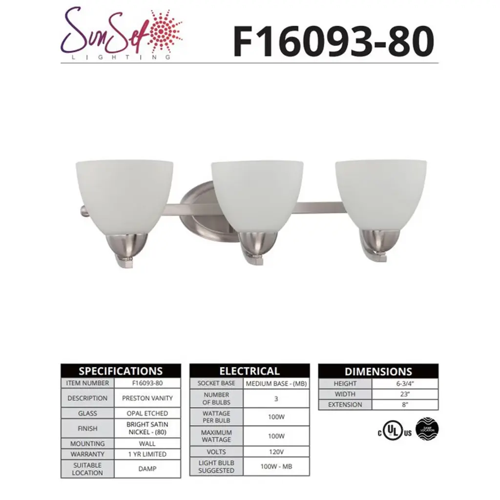 Sunset Lighting Preston Three Light Wall Sconce — Opal Etched Glass, Bright Satin Nickel A clean, contemporary 3-light vanity that pairs softly diffused opal etched glass with a Bright Satin Nickel finish. Damp-rated and sized for standard vanities, it provides clear, flattering illumination over sinks and mirrors. Key Features: • Three-light bathroom vanity wall sconce • Bright Satin Nickel finish with opal etched glass shades • Damp-rated for reliable use over sinks and in bathrooms • Uses medium base (E26) bulbs, sold separately Specifications: • Item Number: F16093-80 • Description: PRESTON VANITY • Glass: Opal Etched • Finish: Bright Satin Nickel (80) • Mounting: Wall • Suitable Location: Damp • Socket Base: Medium Base (MB) • Number of Bulbs: 3 • Wattage per Bulb: 100W • Maximum Wattage: 100W • Voltage: 120V • Light Bulb Suggested: 100W — MB (E26) • Height: 6-3/4” • Width: 23” • Extension: 8”