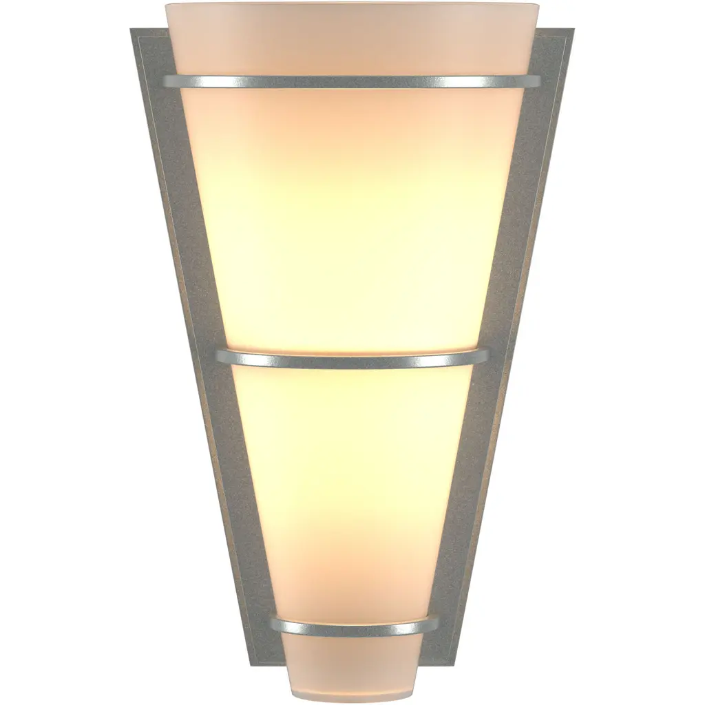 The glass is the focus of our Cone Sconce. Three strips of hand-shaped steel clasp the cone. With the combination of the V-shape of glass and mounting plate and the three bands, the shape of cast light looks fantastic.