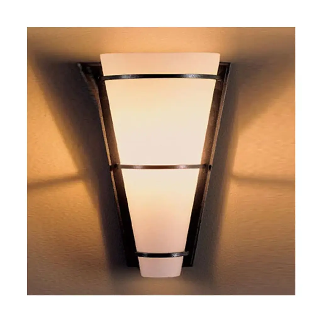 Keep your décor on target with the Suspended Half Cone Wall Sconce - 206551 from Hubbardton Forge. A refined fixture starts with a stepped trapezoidal wall plate fashioned from hand-wrought steel; it tucks a single potent socket under a half-conical shade banded by horizontal steel restraints of progressively smaller size as they descend the shade. This arrangement gentles horizontal glare, transforming it into a warm ambiance that reaches out evenly in all directions.