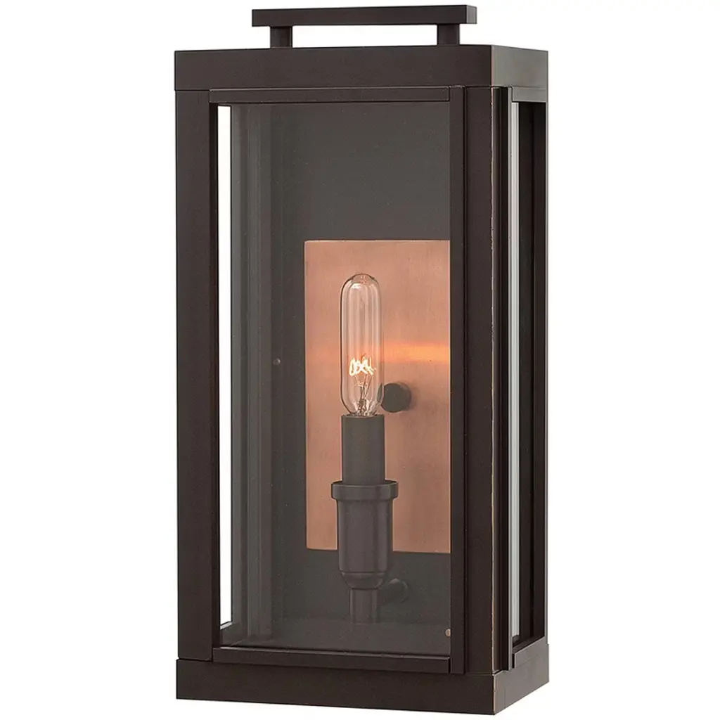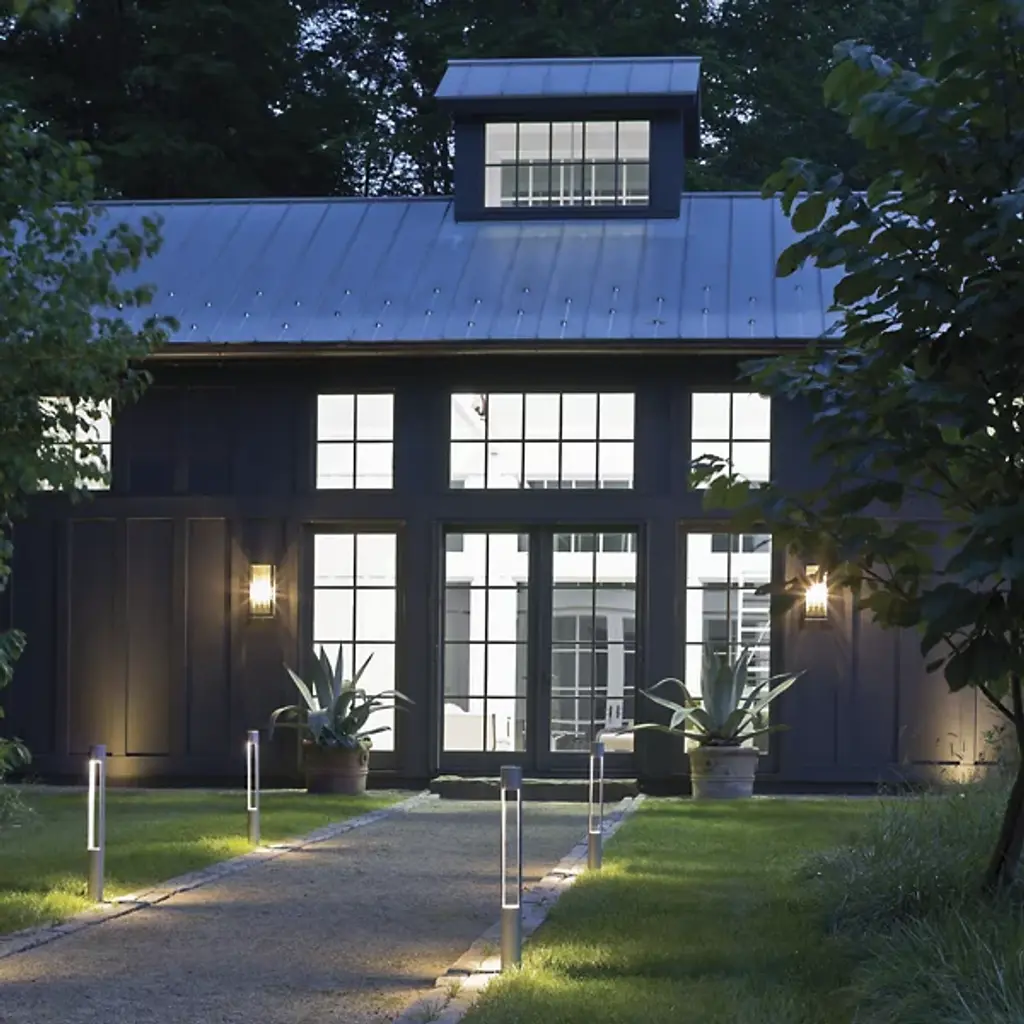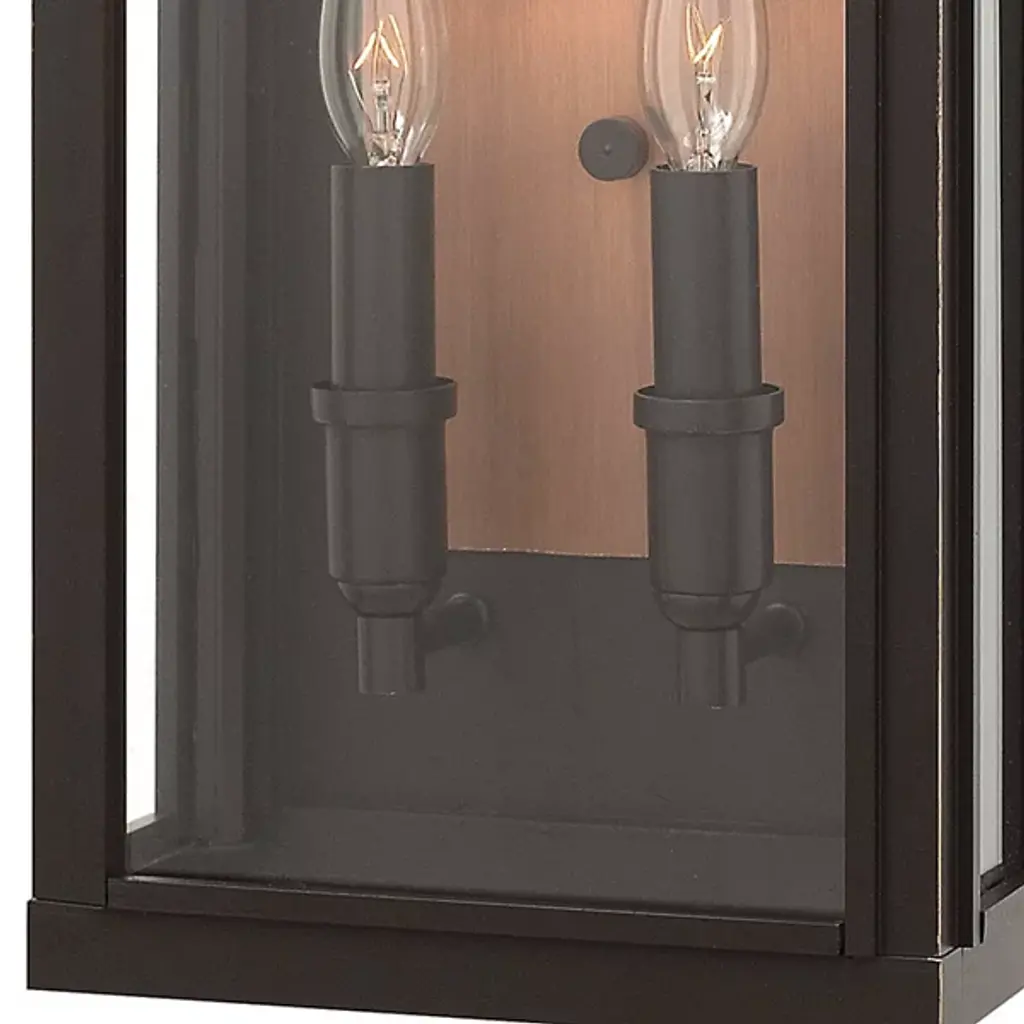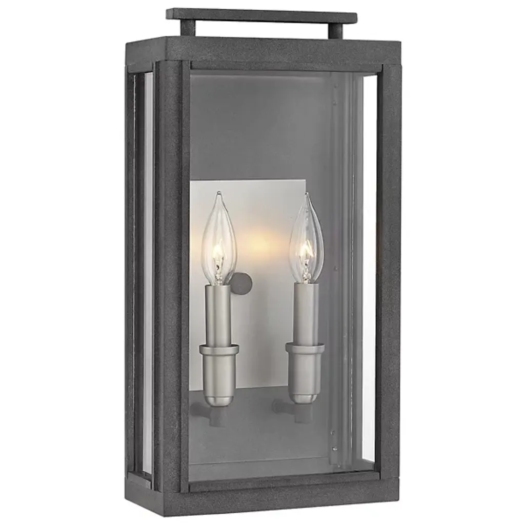 The Sutcliffe Outdoor Wall Sconce by Hinkley Lighting puts a contemporary spin on traditional candelabra lighting. Within its clear glass paneled case (framed in solid aluminum), holders prop up candelabra lamps as though they were active flames. The resulting light is warm, partially diffused, providing a relaxing, yet nostalgic feel to any outdoor setting.