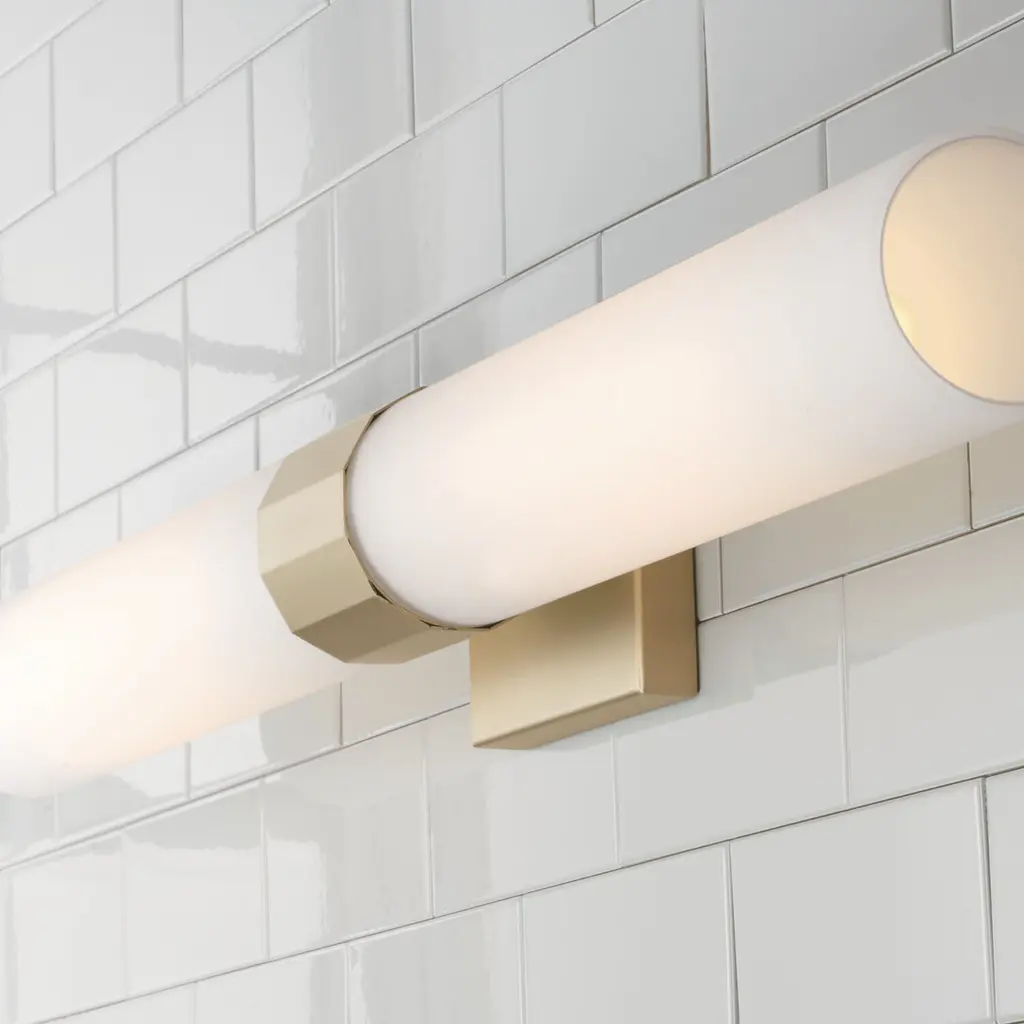 Sophisticated and stunning, the Sutton Dual Sconce puts a tailored touch on a simple form. The champagne sheen of Soft Gold faceted band anchors the two frosted glass shades for elevated elegance.