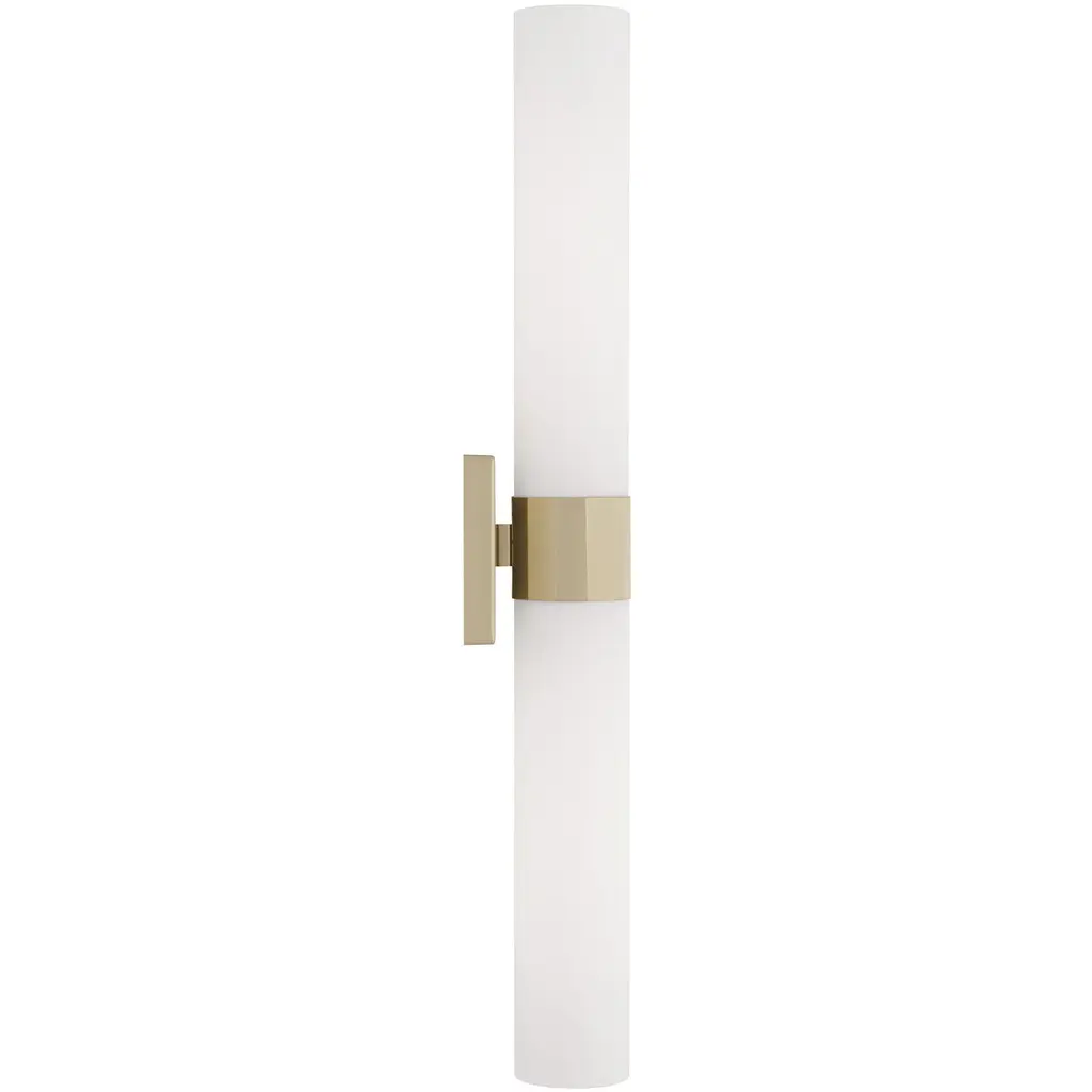Sophisticated and stunning, the Sutton Dual Sconce puts a tailored touch on a simple form. The champagne sheen of Soft Gold faceted band anchors the two frosted glass shades for elevated elegance.