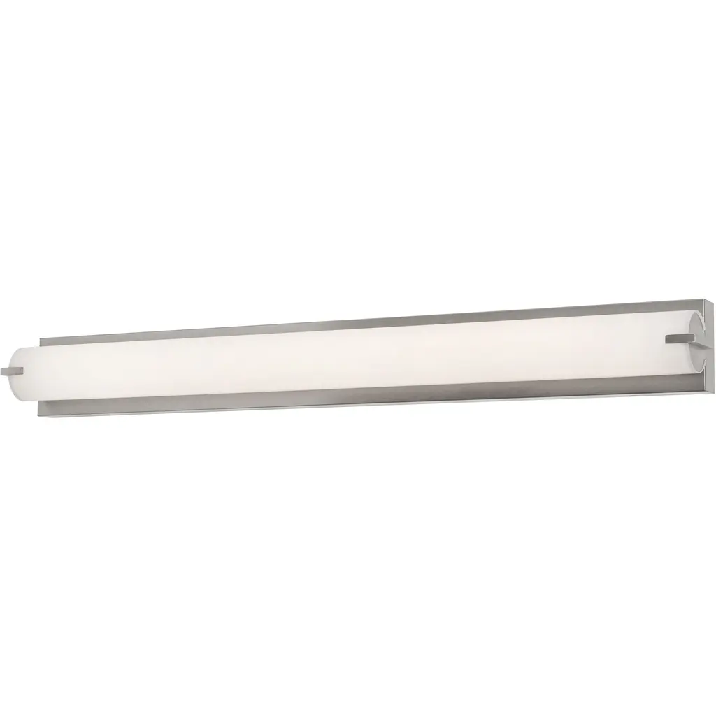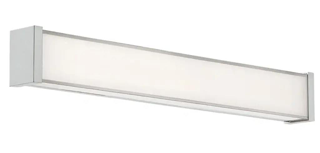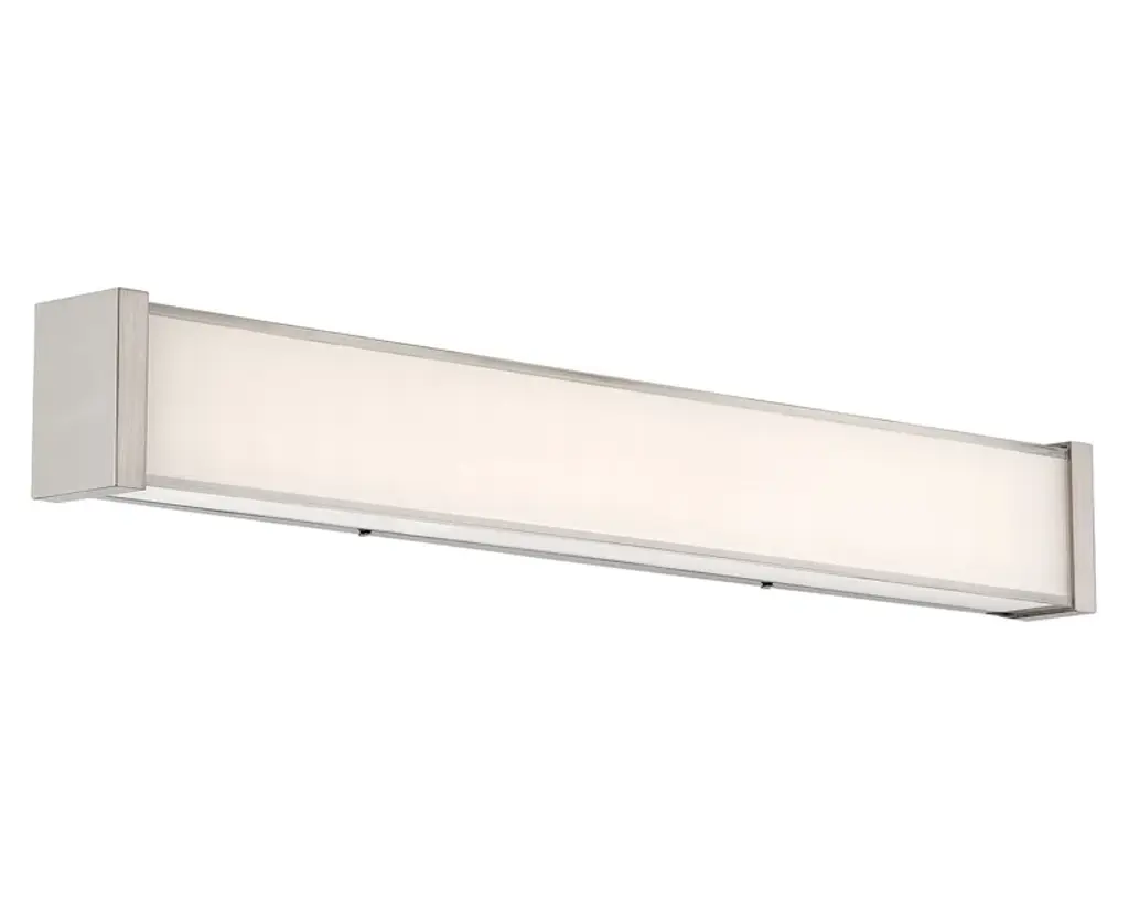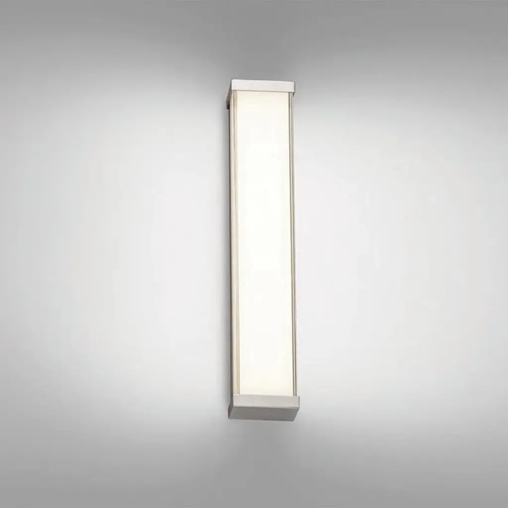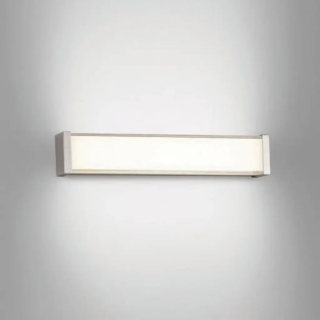 Water clear glass with mitered edge lines speak to the sophistication of this ultra minimalist, rectilinear luminaire, artfully framed with die-cast metal end caps. Robust illumination as a vanity in hospitality bath applications or as a sconce in hallways. Proprietary LED technology.