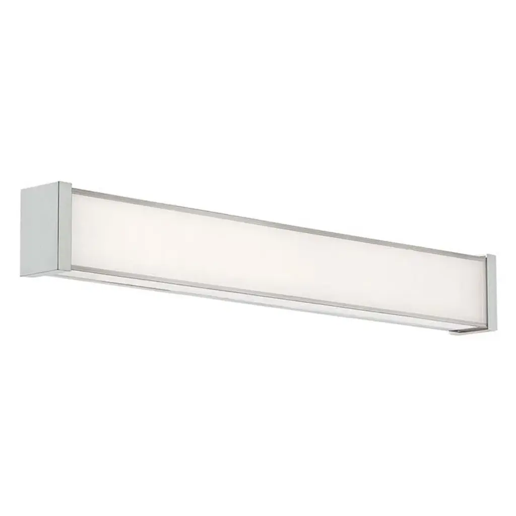 Water clear glass with mitered edge lines speak to the sophistication of this ultra minimalist, rectilinear luminaire, artfully framed with die-cast metal end caps. Robust illumination as a vanity in hospitality bath applications or as a sconce in hallways. Proprietary LED technology.