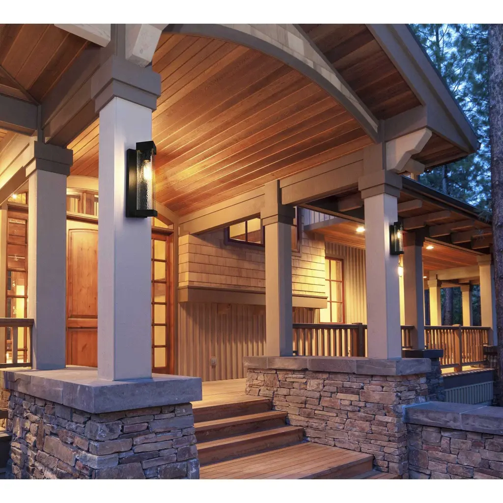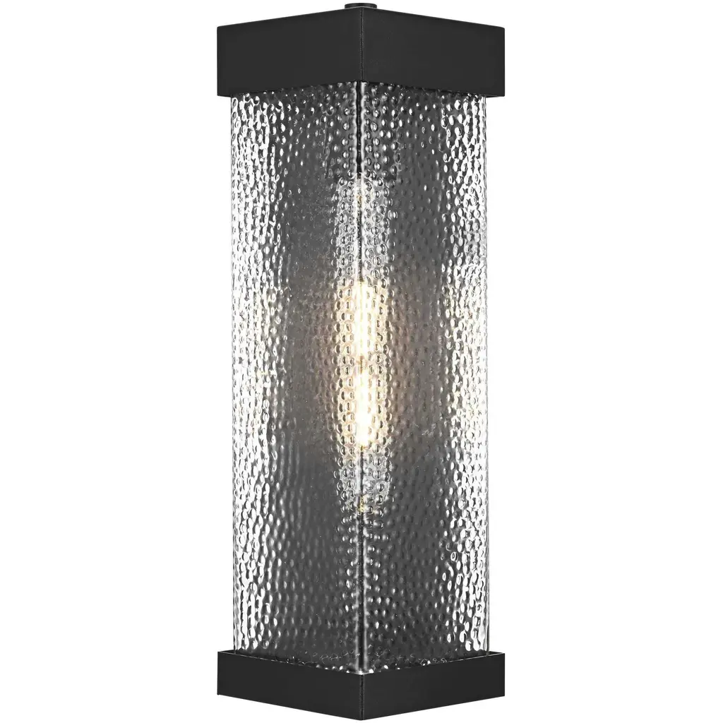 Bring a refined touch to your exterior spaces with this stunning outdoor wall sconce. The design features a black iron frame with a tall rectangular silhouette, providing a timeless and bold statement. The textured, rippled glass panel emits a diffused and inviting light, creating a beautiful ambient glow. The E26 socket offers compatibility with a range of light bulb types, including energy-efficient LED options, while the rugged iron construction ensures durability against the elements. The sconces structured aesthetic, topped and bottomed with iron frames, embodies both strength and sophistication, making it ideal for doorways, patios, or walkways.